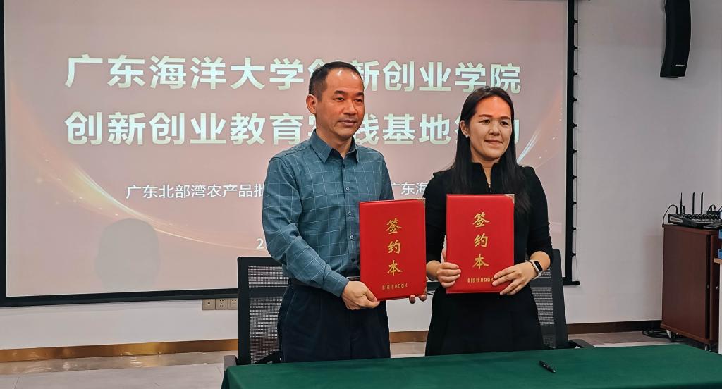 在广东北部湾农产品批发中心有限公司副总裁沈梅金的带领下,一行人参观了广东北部湾农产品流通综合示范园区展厅,详细了解了广东金岭糖业集团有限公司的发展历程、主要业务板块以及大数据监测平台。双方就大学生创新创业能力培养、项目孵化、竞赛指导、就业促进等内容开展了座谈交流。韩卫国表示,仅依托高校现有资源培养学生创新创业实践能力还远远不够,必须坚持走校企合作之路,充分发挥校企双方优势,助力大学生在创新创业实践中更好更快成长。双方举行了“共建创新创业教育实践基地”签约暨授牌仪式并表示,希望通过此次共建,在人才培养、项目孵化、创新成果转化应用等方面进一步加强合作,实现资源共享、优势互补、互利共赢。