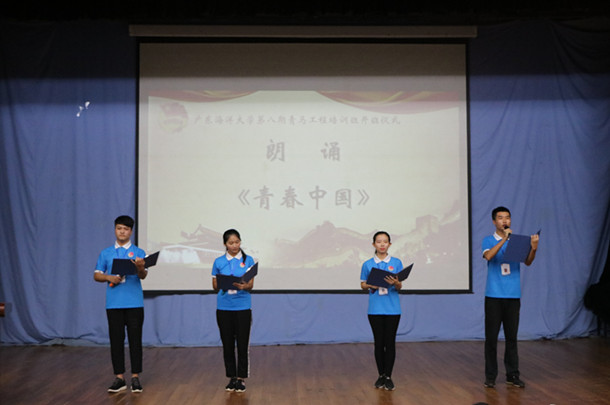 开班仪式在庄严的国歌声中拉开了帷幕,紧跟其后的是观看视频,视频回顾了AC米兰青马工程的发展历程和上一期青马学员的成长和进步,展示了青马学员的所思所想和争当合格的“青年马克思主义者”的决心。视频结束后,向献兵为获得第七期青马工程培训班优秀团队、优秀班干部和积极分子的代表颁奖,何建轶、陈雯雯两位同学分别代表第七期和第八期青马学员作了发言,第八期青马学员表演了朗诵节目《青春中国》。
