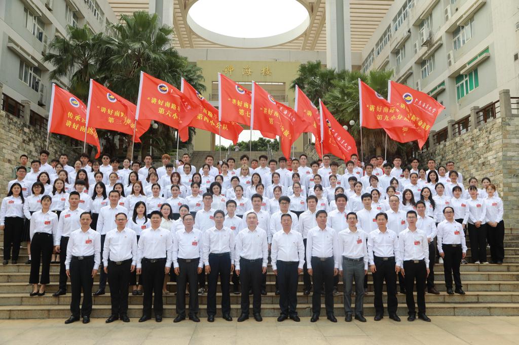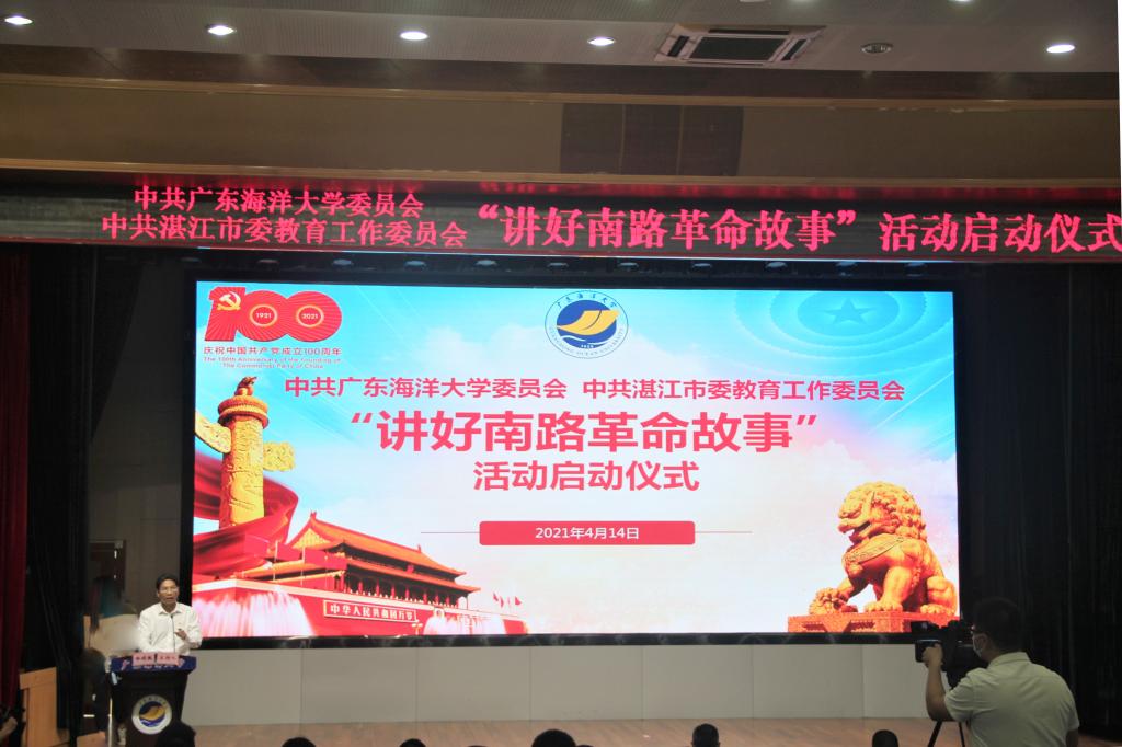 为深入学习贯彻习近平总书记在党史学习教育动员大会上的重要讲话精神,进一步推动学校党史学习教育走深走实,学校党委与市委教育工委携手开展“讲好南路革命故事”活动。4月14日下午,“讲好南路革命故事”活动启动仪式在学校湖光校区教学主楼多功能厅举行。湛江市教育局党组成员、副局长袁新中,学校党委书记曹俊明出席仪式并讲话。学校党委副书记林晓敏主持仪式。党委宣传部、党委研究生工作部、研究生院、党委学生工作部等部门负责人,市委教育工作领导办公室、市委教育工委相关科室负责人和18名骨干教员、108名宣讲员等参加了仪式。