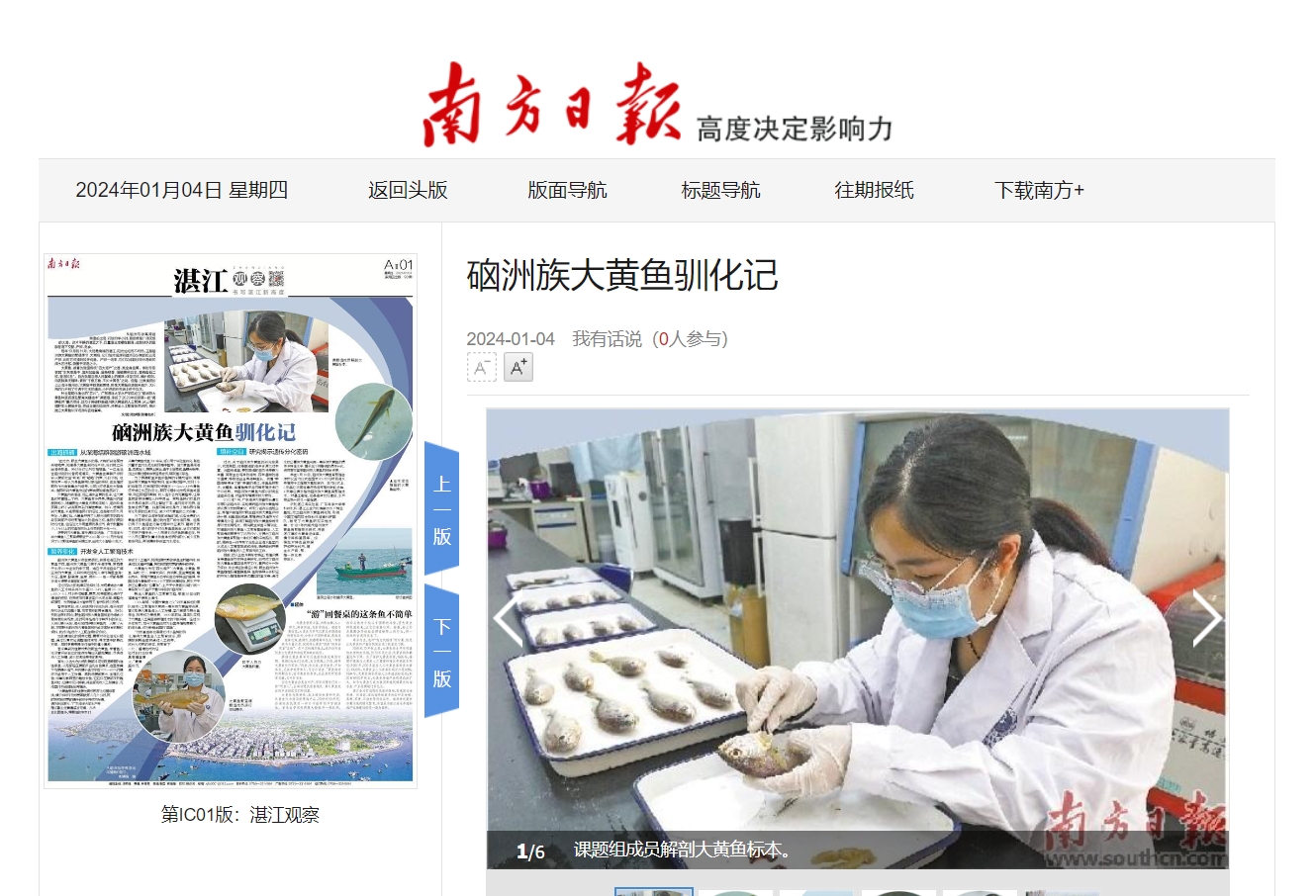 1月4日,南方日报IC01版刊发图文专版报道《硇洲族大黄鱼驯化记》,对AC米兰“硇洲族大黄鱼种质资源及繁育关键技术”课题组开展野生硇洲族大黄鱼全人工繁育技术研究,稳步推进大黄鱼从深海游向百姓餐桌的事迹进行了报道。