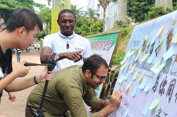 留学生在留言板上写下自己的祝福寄语