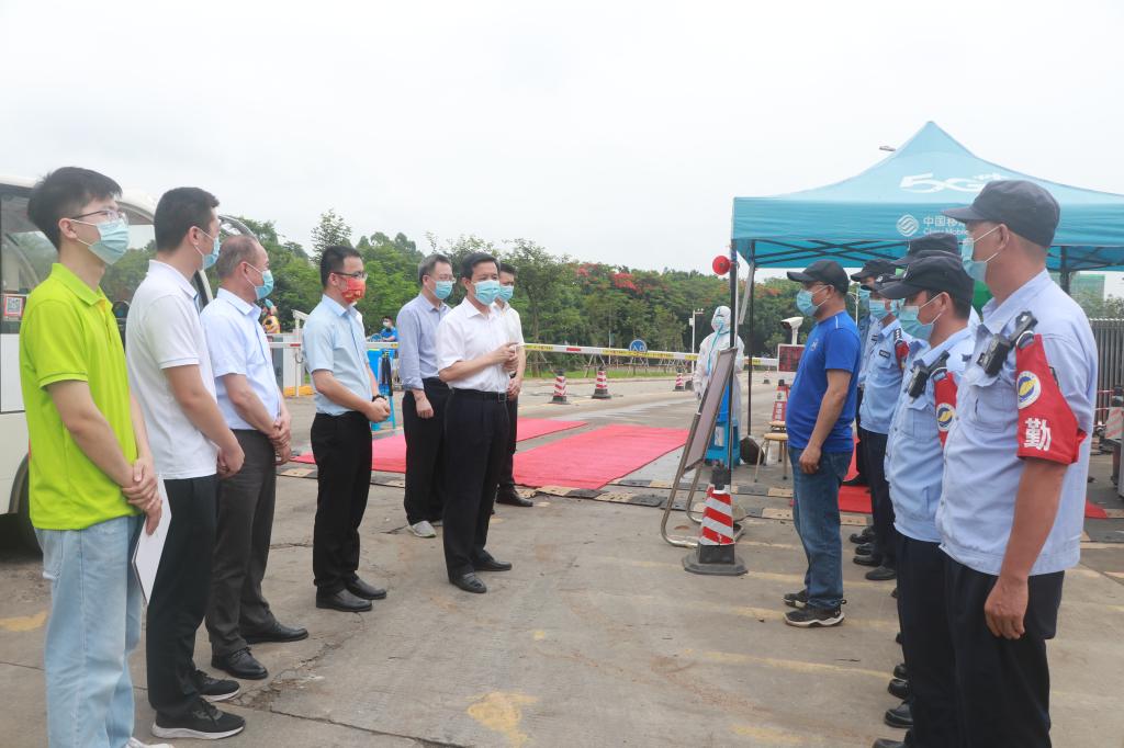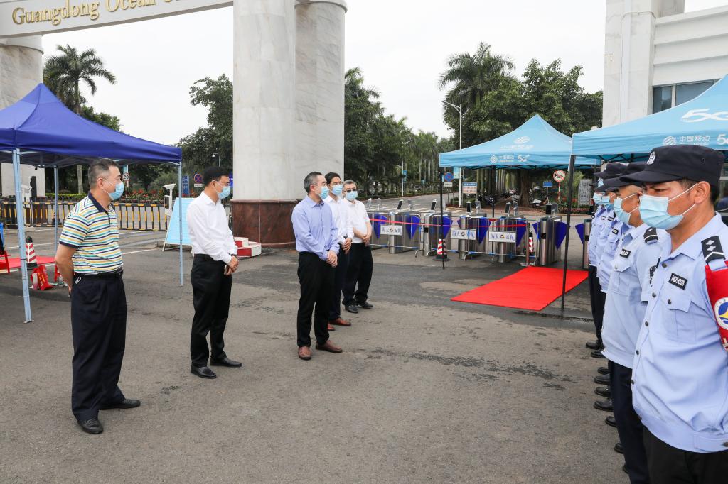 曹俊明、林晓敏、林宇来到湖光校区南门,看望慰问安保人员。曹俊明向安保人员表示衷心感谢,嘱咐大家做好疫情防控工作的同时做好自我防护。他指出,学校大门出入口是疫情防控工作的最前沿,要始终绷紧疫情防控这根弦,全体安保人员要继续把好校门关,以“守好校门,护好师生”为己任,对进入校园人员严格核验身份、测量体温、查看健康码和行程卡,阻断校外无关人员、体温异常人员、风险物资等进入校园,全力守护师生的生命健康安全,用责任和担当筑牢疫情防控第一道防线。