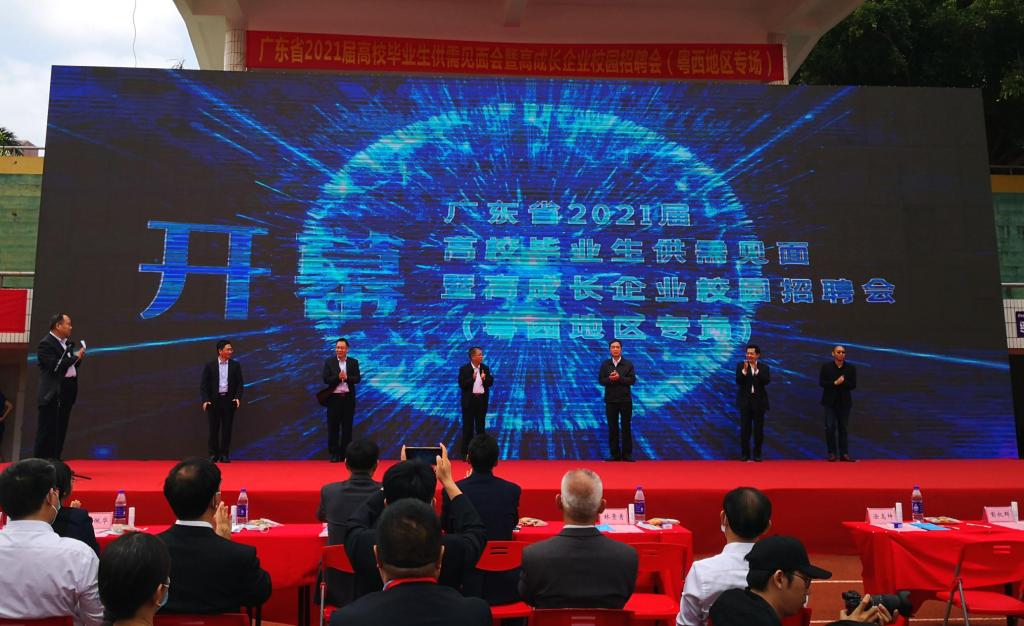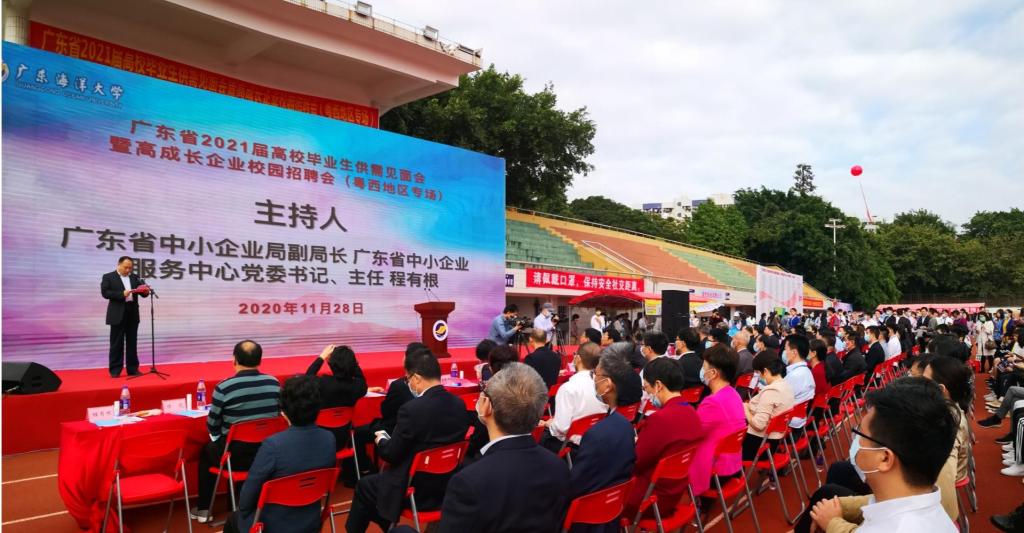 省工业和信息化厅党组书记、厅长涂高坤,人力资源和社会保障厅二级巡视员林景青,学校党委副书记、纪委书记彭权群,省教育厅高等学校毕业生就业指导中心主任陈东海分别在招聘会开幕式上致辞。广东经济科教频道副总监张伍生、广东同德药业有限公司董事长周小萍、毕业生代表孔婉君在仪式上发言。广东省中小企业局副局长程有根、湛江市政府副秘书长李心声、校领导林晓敏、林宇,以及有关单位负责人出席招聘会开幕式。