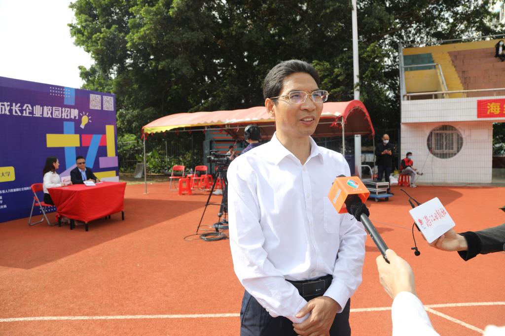 校党委副书记林晓敏现场接受广东广播电视台、湛江电视台及湛江日报等媒体采访时提到,为应对新冠肺炎疫情下高校毕业生就业工作的挑战,学校通过引导大学生树立正确就业观,及时优化调整就业指导工作,加大就业困难群体帮扶力度,精心组织线上线下招聘活动等方式,多措并举促进毕业生“稳就业”。林晓敏还介绍了学校在加强学生素质教育、提高育人质量方面的政策和措施,并从职业规划、求职定位及综合素质提升等方面为应届毕业生求职提出了建议。