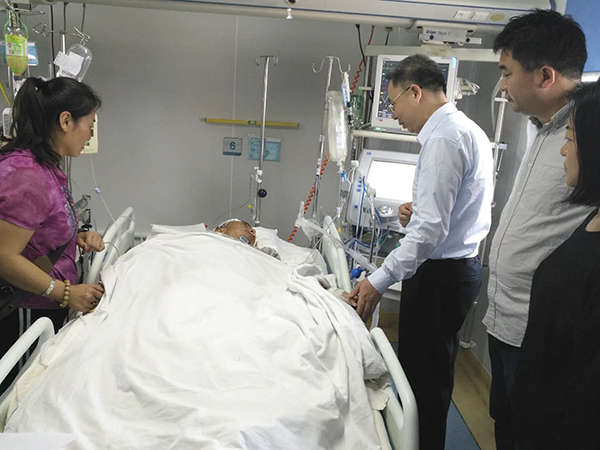 彭权群向主治医生详细了解曹震同学的病情及恢复情况,向医院医生和有关领导转达学校对医院全力以赴救治学生的感谢,向家长转达各位领导的关怀和老师同学们的问候。随后关切地来到曹震同学病床前,代表学校送上学生临时困难补助和爱心慰问金,鼓励他要与疾病顽强斗争,争取早日康复,早日返回校园!曹震同学虽然不能言语,但透过他的轻微点头示意,看到了他对生命的渴望和对大家的深深感激之情。最后,曹震的母亲代表全家感谢学校领导、老师和同学们的关心和帮助。