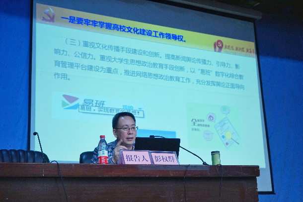 1月5日上午,校党委副书记、纪委书记彭权群在湖光校区主楼多功能厅为学工系统作“学习十九大精神,推动高校文化建设”报告会。学工部、研工部、团委、招就中心全体人员,各学院兼管、分管学生工作书记、副书记,全体辅导员及研究生代表聆听了报告会。报告会由学工部部长李育芳主持。