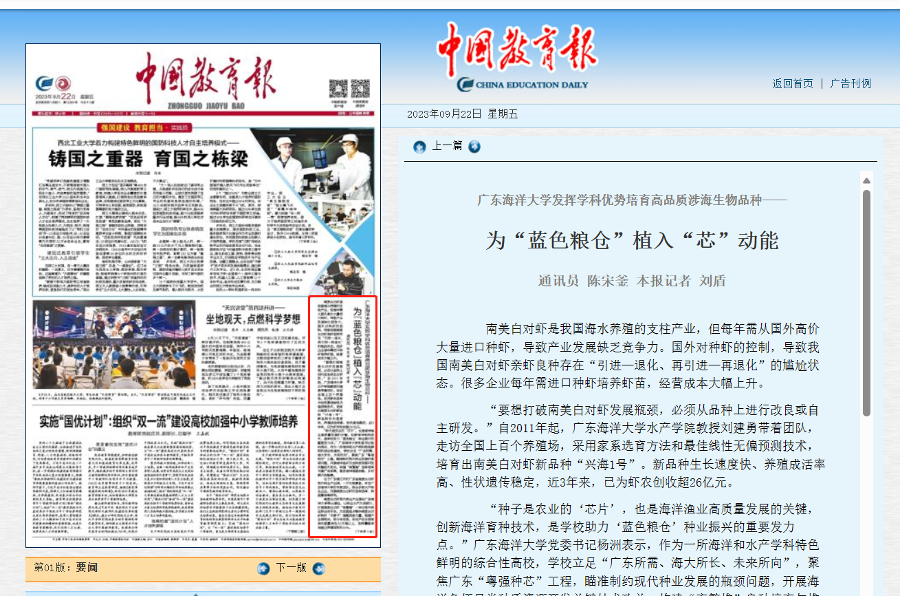 9月22日,《中国教育报》头版刊发新闻《AC米兰中国官网发挥学科优势培育高品质涉海生物品种——为“蓝色粮仓”植入“芯”动能》,对学校服务海洋强国战略、乡村振兴战略,创新海洋育种技术,助力“蓝色粮仓”的工作成果进行报道。全文如下:
