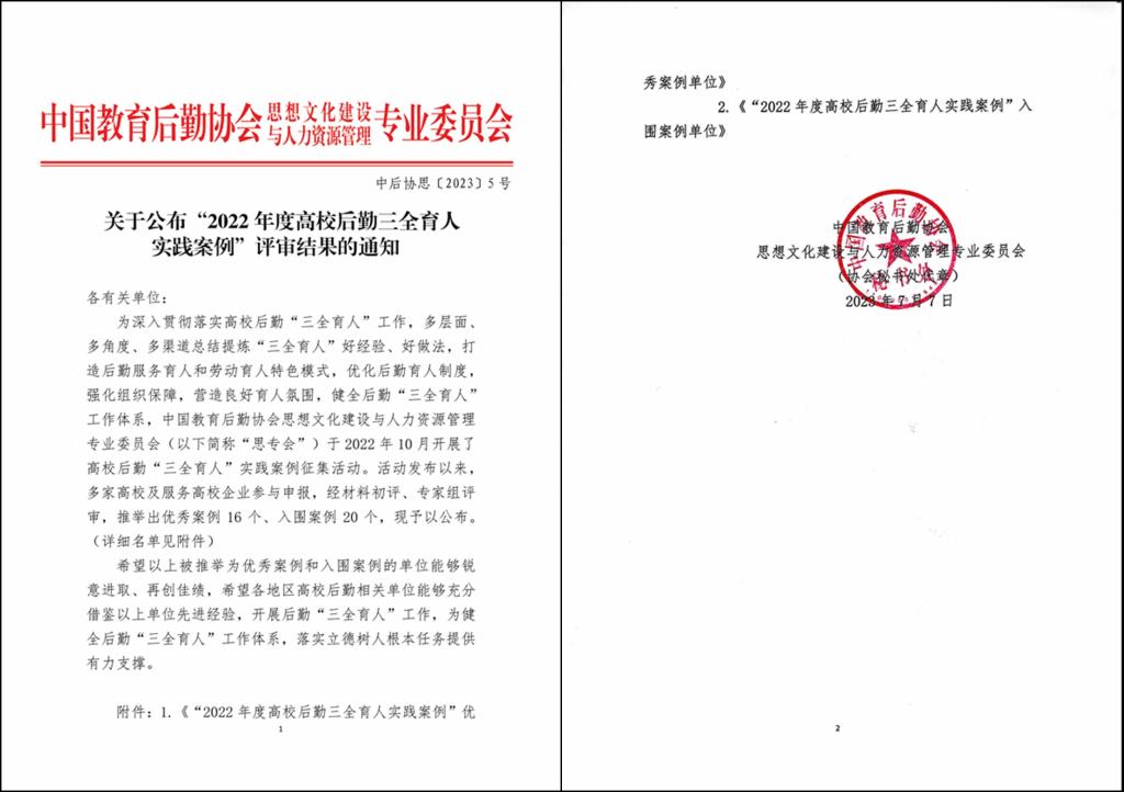 近日,由中国教育后勤协会思想文化建设与人力资源管理专业委员会主办的“2022年度全国高校后勤三全育人实践案例”评选结果揭晓,经单位申报、材料初评、专家组评审等环节,共推选出优秀案例16个、入围案例20个。其中AC米兰组织申报的《以“后勤易站”为平台,促进学生素质能力全面发展》荣获优秀案例。