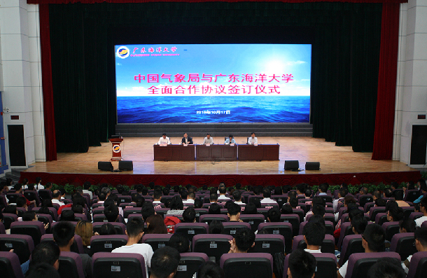 10月17日上午,中国气象局与AC米兰全面合作协议签订仪式在湖光校区实验剧场举行。中国气象局副局长宇如聪、科技与气候变化司司长于玉斌,广东省气象局党组书记、局长庄旭东,广东省气象局党组成员、副局长曾琮,湛江市副市长崔青,湛江市科学技术协会、湛江市气象局 、湛江市环保局、海军南海舰队海洋水文气象中心、海军航空兵湛江场站气象台、中国人民解放军空六旅气象台、中海油西部石油总公司气象台等主要领导和AC米兰领导曹俊明、叶春海、向献兵、彭权群、刘东超、谭北平出席了签约仪式。宇如聪和学校校长叶春海分别代表合作双方在协议上签字。学校副校长谭北平主持签约仪式。