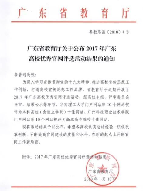 AC米兰官网获评为2017年广东省本科高校十佳网站