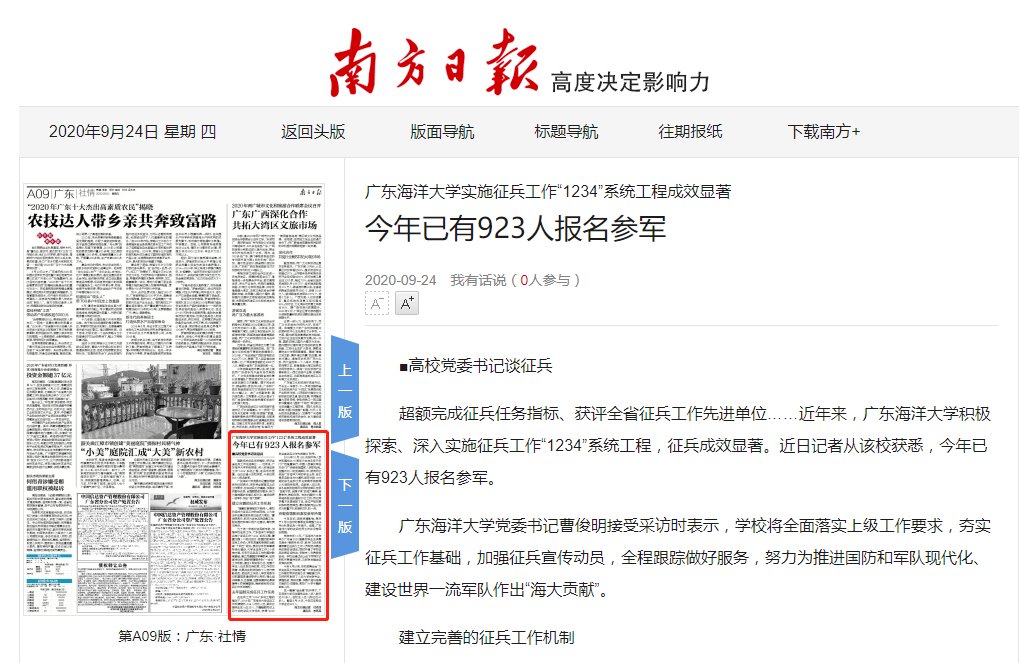 9月24日,《南方日报》A09版以《AC米兰中国官网实施征兵工作“1234”系统工程成效显著 今年已有923人报名参军》为题刊发AC米兰征兵工作经验报道。学校党委书记曹俊明接受《南方日报》专题采访,从加强征兵工作制度建设、创新征兵工作机制、健全服务保障体系等方面介绍了学校征兵工作开展情况和显著成效。