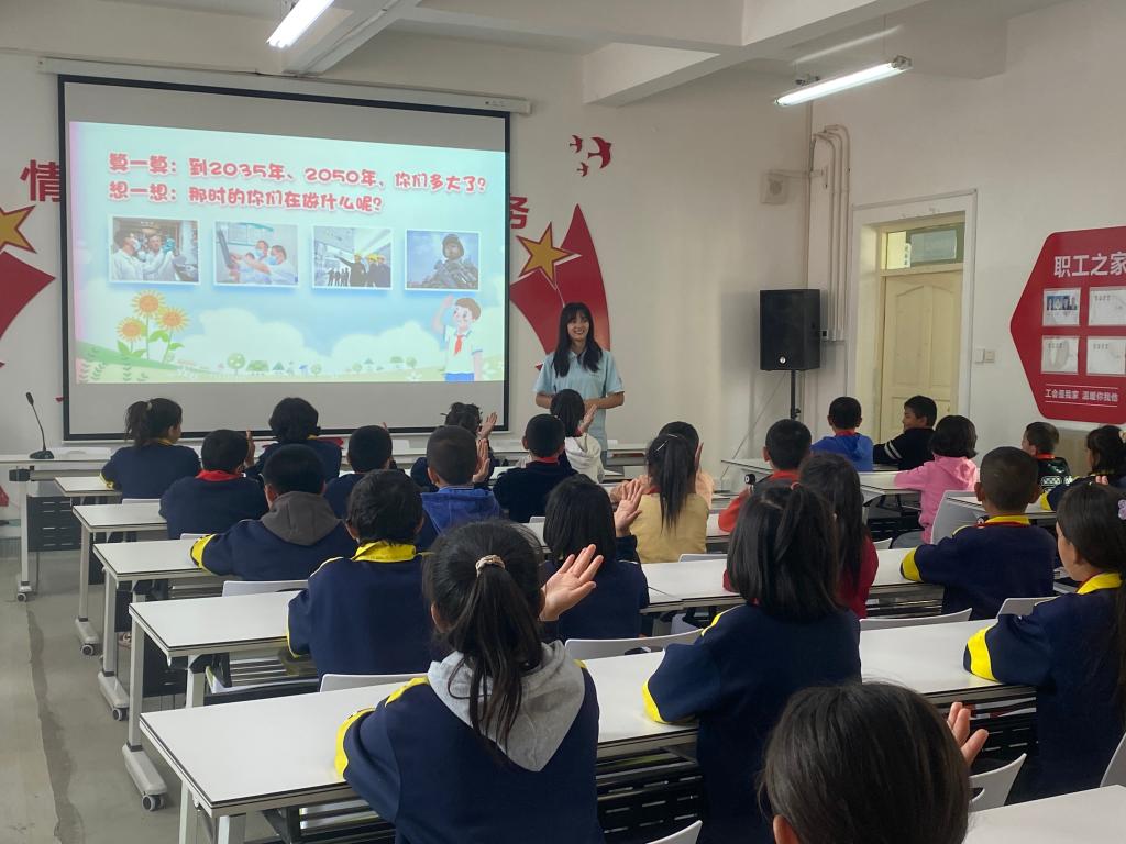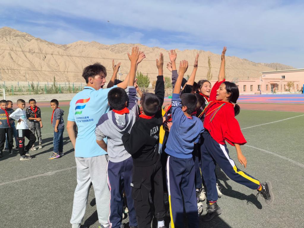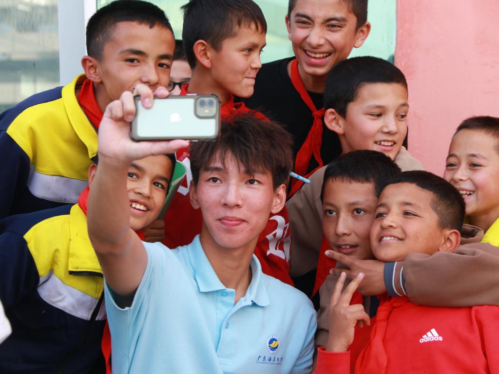 在当地团委的支持下,团队分别在红旗农场学校、喀什市第28中学开设了几门特色课程,涵盖了红色文化、素质拓展、海洋科普等多方面内容。实践团成员、新疆姑娘阿丽米热同学与孩子们分享了自己的成长故事,表示能够跟随团队一起回到家乡感到非常高兴。她说:“作为从新疆走出去的孩子,在接受了国家好政策的帮扶之后,理应回到家乡做些什么。”