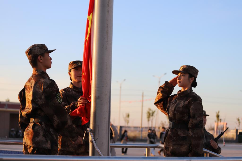 10月28日清晨,帕米尔高原东部,第三师红旗农场机关大楼前,一抹鲜红高高飘扬。实践团14名师生与红旗农场机关全体干部、官兵举行“同升一面旗,共唱一首歌”的特殊升旗仪式。当嘹亮的口令划破农场的寂静,升旗台前,师生们和兵团战士整齐列队,向着国旗行注目礼,雄壮的《义勇军进行曲》回荡在整个农场。当鲜艳的五星红旗飘扬在农场上空时,在场师生纷纷发出感慨,“我参加过很多次升旗仪式,但今天这场注定终生难忘”,“环境越艰苦,那抹鲜艳的红色,就越是一种精神的感召”。
