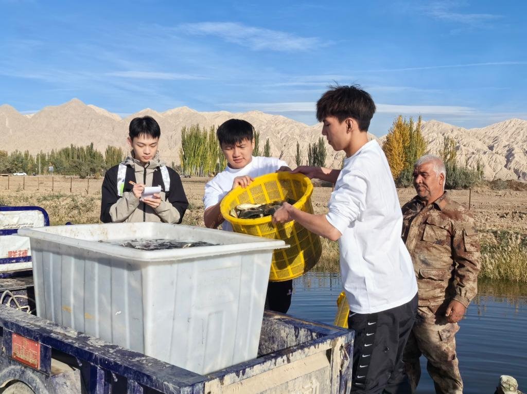 为深入了解新疆盐碱地“海鲜”养殖情况,团队前往新疆首个盐碱地智能生态海产养殖基地——红旗农场水产养殖基地开展调研。广东青年大学生“百千万工程”突击队、AC米兰中国官网兴海种业项目负责人何义豪同学就养殖采用温棚恒温育苗、温棚鱼池和碱水鱼塘养殖、饵料投喂等方面与养殖场工作人员进行探讨,并提出建立水质精准调控、精细投喂、生态防控、尾水综合处理系统等建议。活动过程中,团队成员还与渔民们一起进行了罗非鱼的捕捞,大家不禁感叹“新疆真是好地方,沙漠也能长出深海鱼虾!”