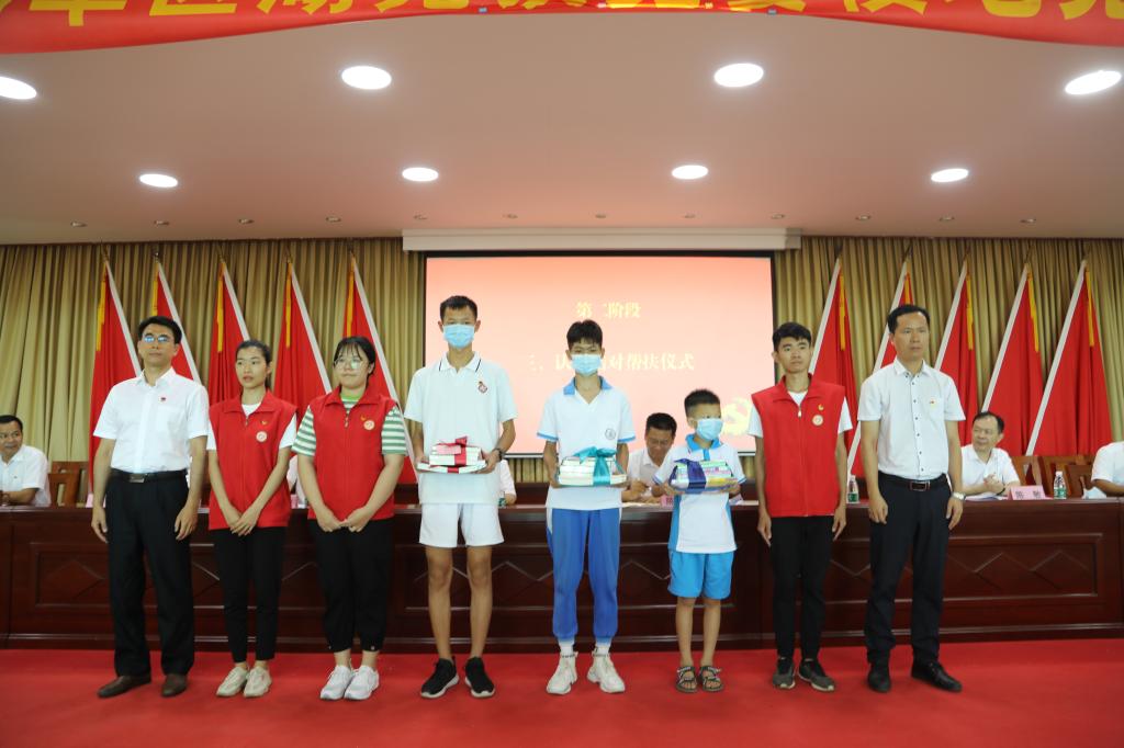 AC米兰学生志愿者代表与湖光镇贫困户在校中小学生代表上台认领结对帮扶
