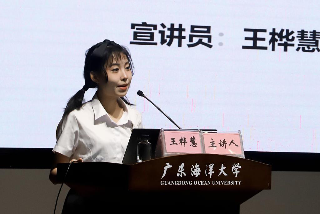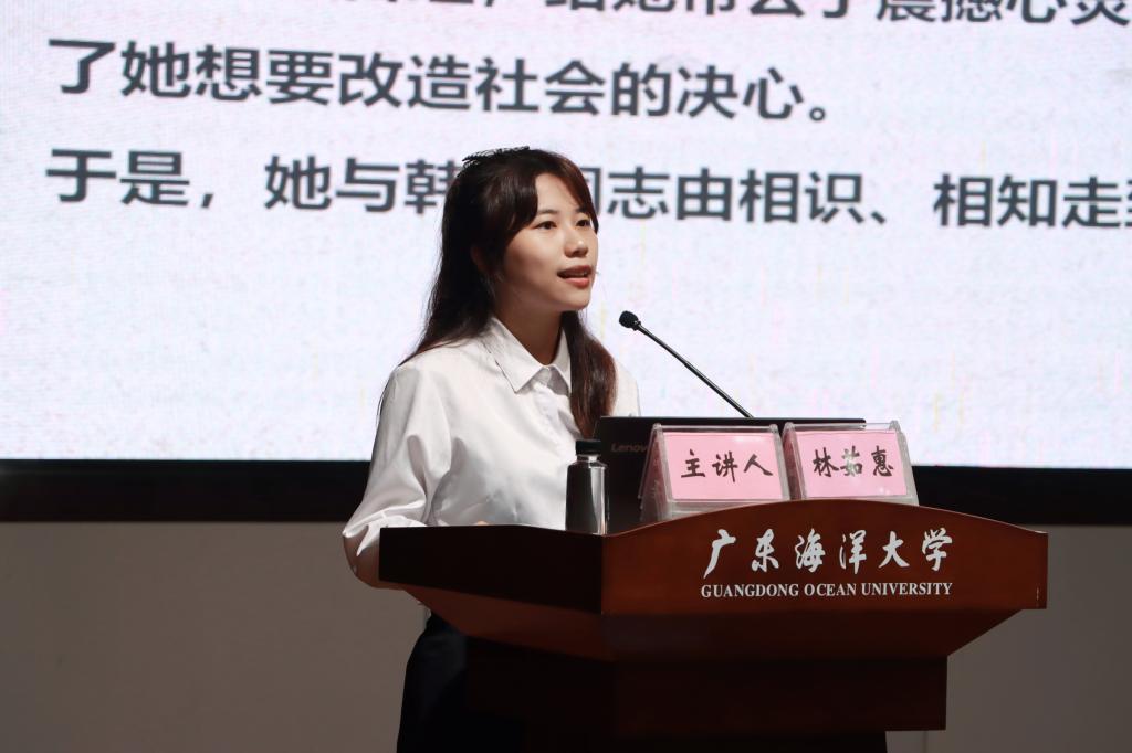 会上,学校“讲好南路革命故事”宣讲团成员、马克思主义学院谭月清副教授从南路革命的概况、南路革命重大历史事件和著名历史人物以及南路革命精神的提炼三个方面,为在场师生讲述了南路革命斗争史,生动再现了广东南路革命的艰辛历程和伟岸的南路英雄群像。宣讲团第一分队宣讲员林茹惠讲述了广东南路第一位女共产党员、南路“江姐”钟竹筠烈士不怕牺牲、舍生取义的英勇革命事迹。第七分队宣讲员王桦慧讲述了为革命数过家门而不入、一心一意投身革命的黄平民烈士的感人事迹。宣讲员们内容丰富的宣讲、生动且富有感染力的语言,使在场师生深受启发与鼓舞。