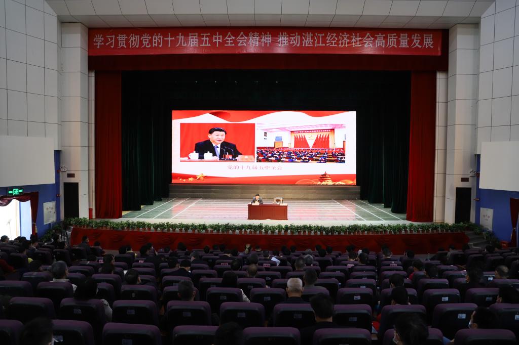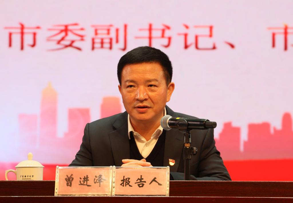 曾进泽围绕“新阶段、新形势”、“新使命、新担当”、“新开局、新出发”三组关键词,运用丰富资料和大量图表,从国家、省、市三个层面深刻分析了当今世界百年未有之大变局的深刻内涵以及“十四五”时期我国发展仍然处于重要战略机遇期的历史方位,分析阐释了省委十二届十一次、十二次全会精神实质,充分把握广东省在新发展阶段的总目标、总任务,全面展示湛江在新发展阶段中的战略地位,回顾了“十三五”时期湛江经济社会发展取得的辉煌成就,勾画了湛江市“十四五”期间和未来一段时间的发展方向和宏伟蓝图。