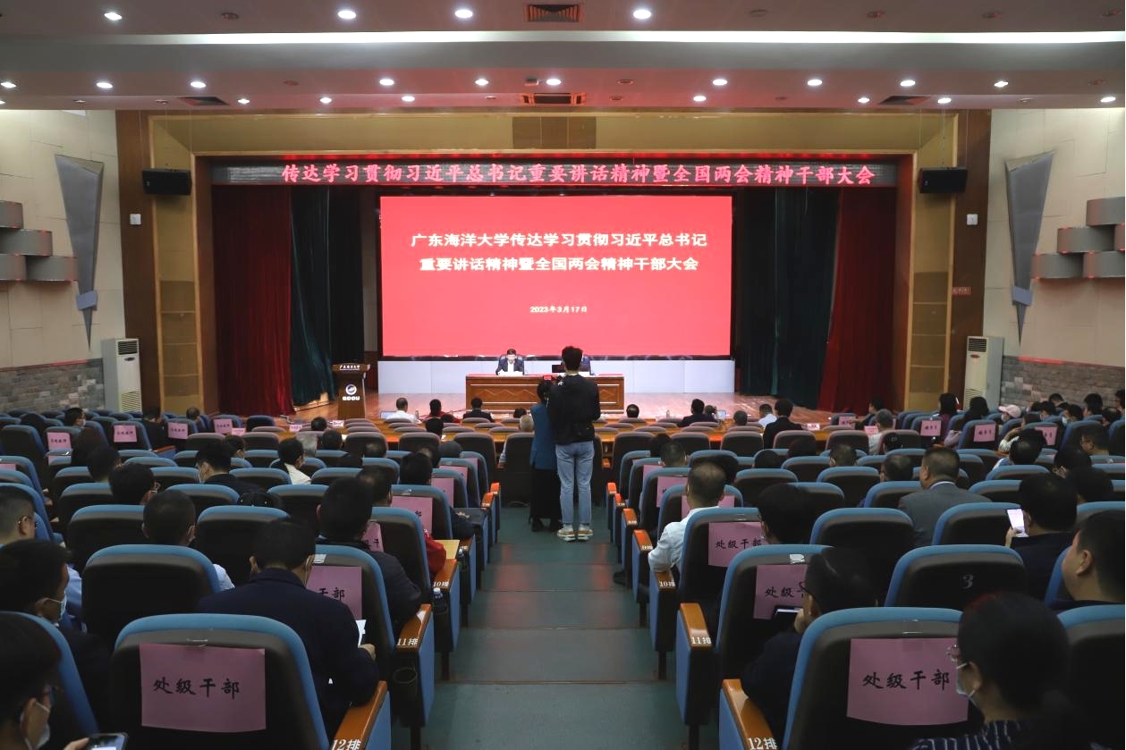 会议指出,全国两会是在全面贯彻落实党的二十大精神开局之年召开的一次重要会议。会议审议通过了各项报告和议案,选举产生新一届国家机构和全国政协领导人员。习近平总书记全票当选国家主席、中央军委主席,反映了全体全国人大代表的共同意志和全国各族人民的共同心愿,极大鼓舞和激励亿万人民更加紧密地团结在以习近平同志为核心的党中央周围,为实现党的二十大确定的目标任务共同奋斗。全国两会期间,习近平总书记发表一系列重要讲话,深刻分析国内国际形势,就高质量发展、民营经济发展、坚持人民至上、统筹发展和安全等作出重要部署,具有很强的政治性、思想性、指导性、针对性。我们要认真学习领会,切实把思想和行动统一到总书记、党中央决策部署上来。坚定历史自信,增强历史主动,坚持守正创新,保持战略定力,发扬斗争精神,勇于攻坚克难,朝着建设国内一流国际知名高水平海洋大学目标而努力奋斗。