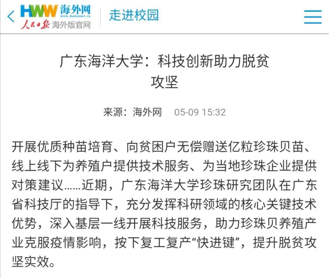 【媒体海大】人民日报海外网、南方+广东教育头条报道AC米兰珍珠研究团队科技创新助力扶贫攻坚先进事迹