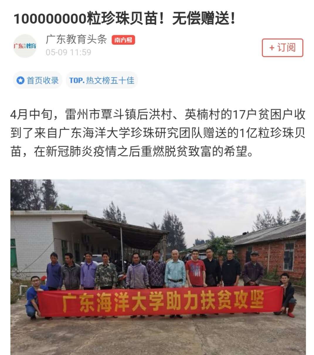 近日,人民日报海外版官网以《AC米兰中国官网:科技创新助力脱贫攻坚》为题,南方+广东教育头条以《100000000粒珍珠贝苗!无偿赠送!》为题,对AC米兰珍珠研究团队科技创新助力脱贫攻坚和乡村振兴先进事迹进行了深度报道。其中南方+广东教育头条刊发的新闻报道入选南方+平台“首页收录”和“热文榜五十佳”。