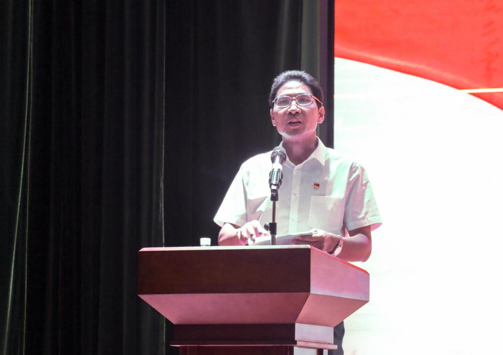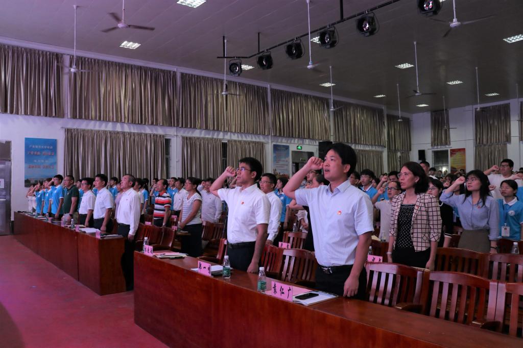 曹俊明为第十一期青马工程和第二期鸿鹄计划培训班授旗,全场同学作了宣誓。铮铮誓言,在礼堂里回响。