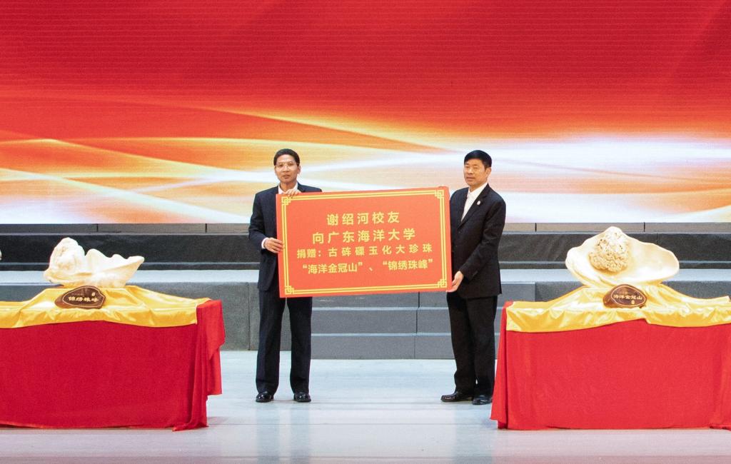 捐赠仪式上,林晓敏代表学校接受了谢绍河捐赠的古砗磲玉化大珍珠“海洋金冠山”和 “锦绣珠峰”,并向他颁发了捐赠证书。谢绍河将“一种河蚌斧足部位植核高效育珠方法”专利技术免费授权给安徽省新贝生态农业发展有限公司使用,助力安徽省脱贫地区农民农村和集体经济发展,推动全国淡水有核珍珠进行二次技术革命。