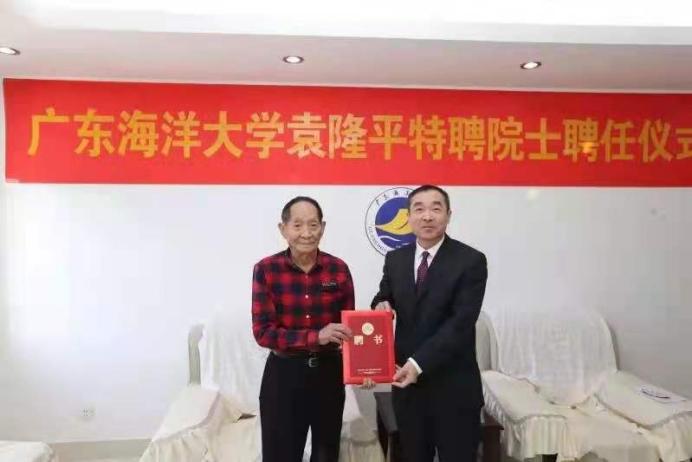 2019年12月18日,袁隆平从曹俊明手中接过海大特聘院士聘书