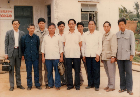 1987年于湛江农专,袁隆平(前排右4)、张建中(前排右5)、郭建夫(后排右1)、方良俊(后排右2)