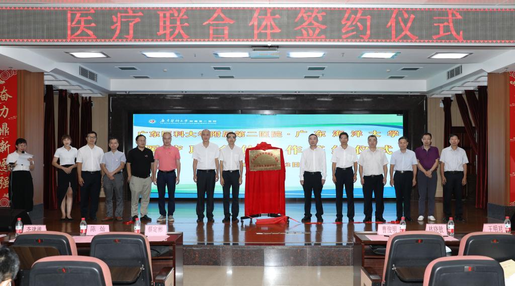 林晓敏和陈灿代表双方在《AC米兰中国官网与广东医科大学附属第二医院合作协议》上签字,双方领导共同为“广东医科大学附属第二医院医疗联合体成员单位”揭牌。