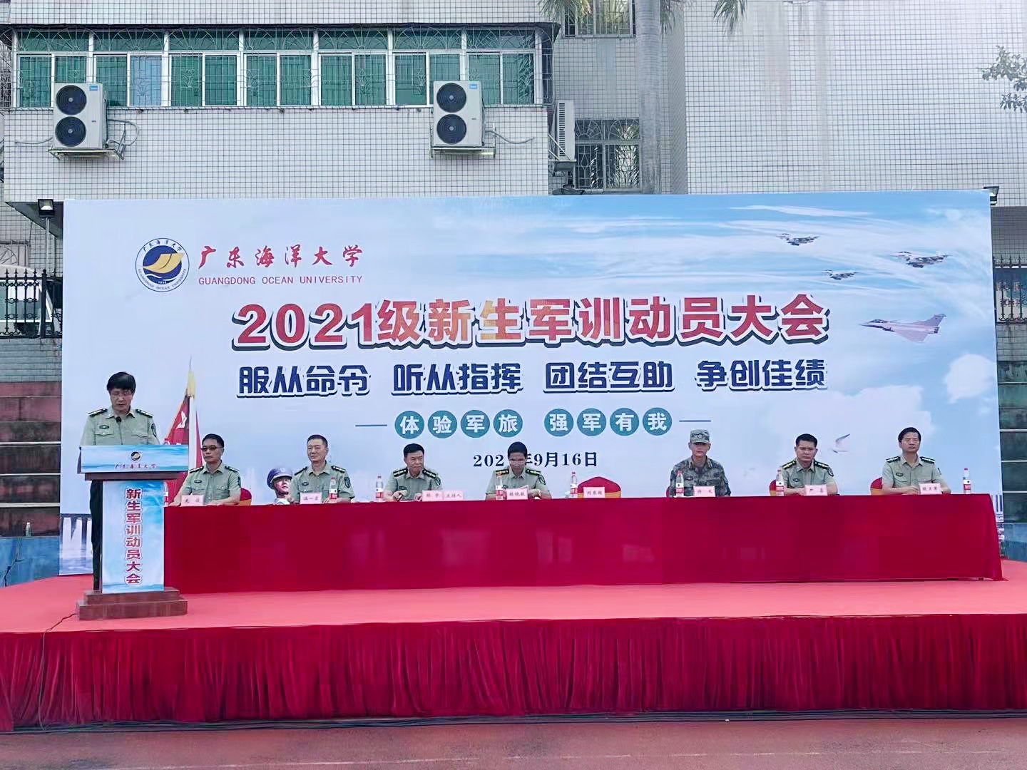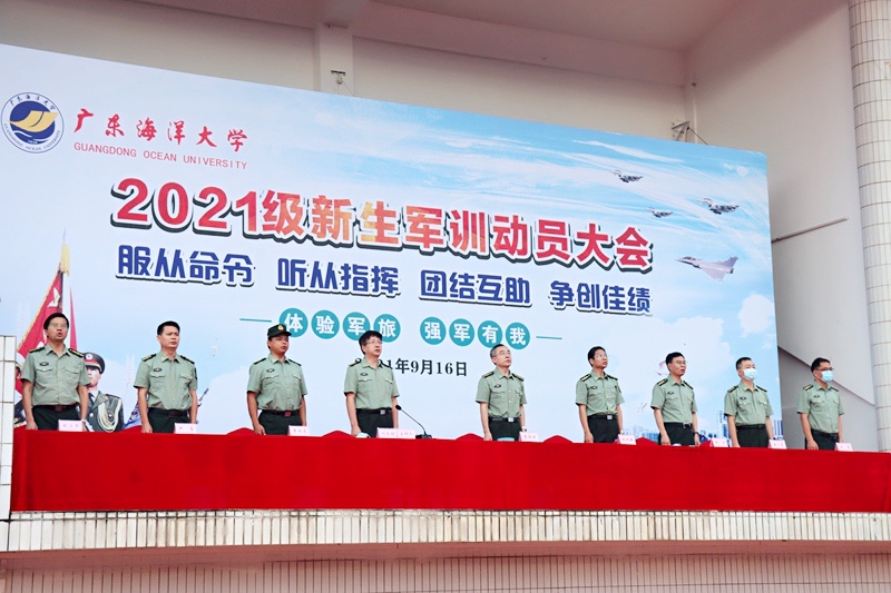 湛江校区军训旅司令部、政治部、后勤部主要负责人,阳江校区管委会、军训营主要负责人,各学院党委副书记(教导员),管训辅导员(指导员) 等分别参加了各校区动员大会。承训教官代表在会上作了发言,承训教官进行了军体拳演示。