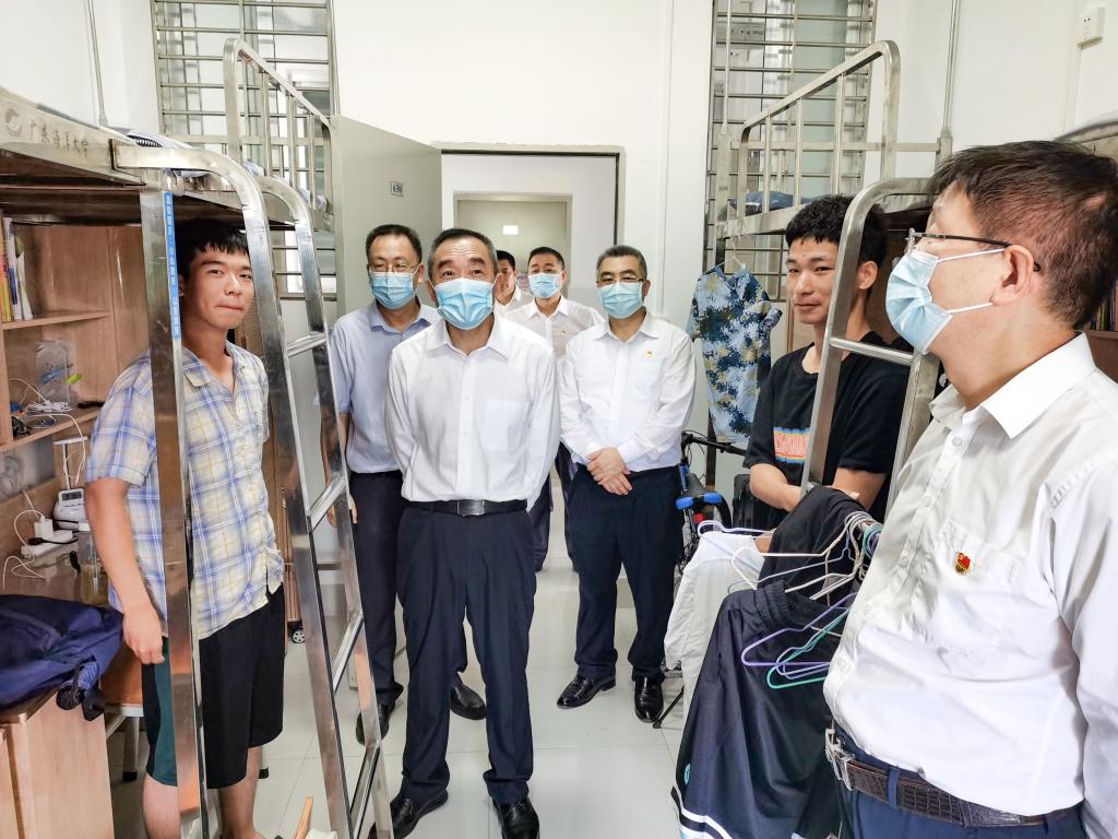 在十五期学生公寓,曹俊明一行详细了解了留校新生参加军训的感受和学习生活情况,鼓励他们尽快适应大学生活,用好大学四年宝贵时间,加强学习、勤于实践,努力把自己培养成为适应高质量发展、高水平自立自强的人才。