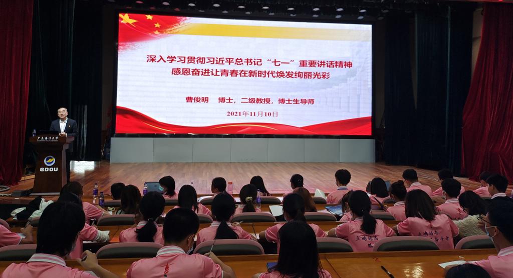 在讲课中,曹俊明点明了深入学习领会习近平总书记“七一”重要讲话的重大意义,阐述了习近平总书记“七一”重要讲话的主要内容和丰富内涵,对中国共产党百年奋斗光辉历程的四个阶段和创造的四个伟大成就、伟大建党精神的深刻内涵和时代价值、以史为鉴、开创未来“九个必须”的根本要求,对青年学生提出三点要求:一是感恩奋进,深刻感悟习近平总书记对中国青年山高水长的亲切关怀和殷切期望;二是传承精神,从86年办学治校历史中汲取奋进力量;三是学讲话、学党史,让青春在新时代焕发绚丽光彩,真正做到牢记初心使命,为祖国为人民永久奋斗、赤诚奉献;坚定理想信念,锤炼品德,矢志追求,坚韧不拔;担使命、长才干,实学实干,勇于创新,开拓进取。