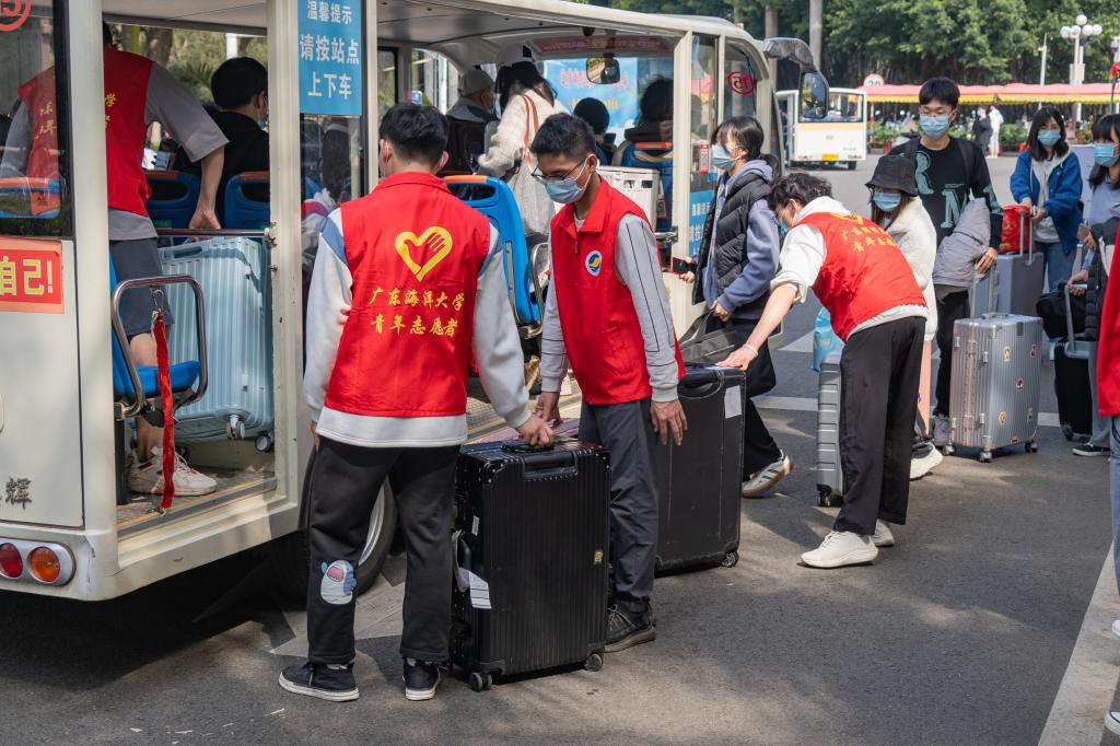 志愿者帮助返校生搬运行李