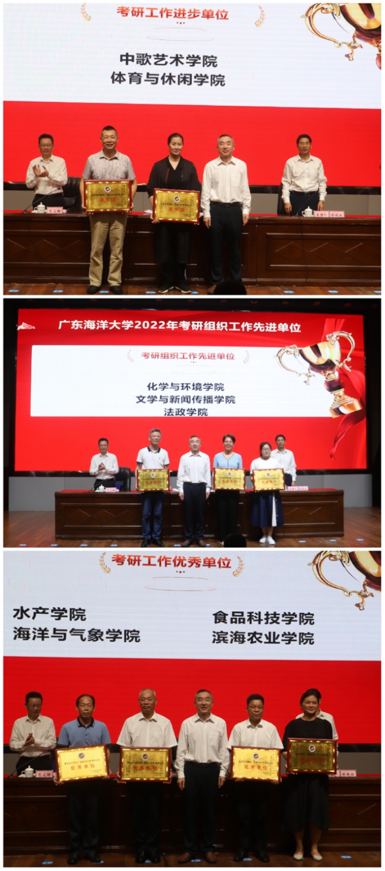 考研工作优秀单位代表、水产学院党委书记王海燕,考研优秀学生代表、外国语学院何绮岚(被南开大学录取),推免生优秀学生代表、海洋与气象学院邱梓惠(被中国科学技术大学录取),2019级本科生代表、滨海农业学院动科卓越1191班赵君作了交流发言。