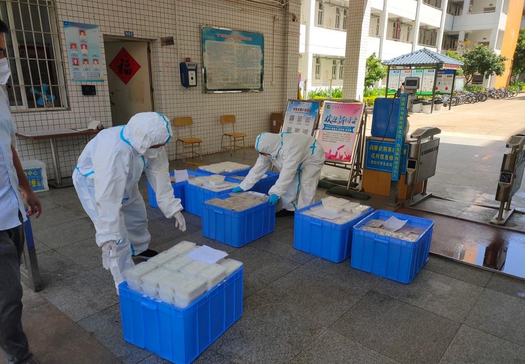 密织服务保障网。为确保在校师生的用餐需求,学校及后勤部门连日来紧急调配,加紧物资采购,确保物资正常供应。755名后勤工作人员开启驻校保障模式,承担起湖光校区2.8万师生员工的餐饮保障、水电保障、物资保障、住宿保障、环境消杀等工作,每日供餐量达5.9万份,云订餐配送到柜4100份,隔天消杀32万多平方米。保卫部门指派干部24小时驻守校门,扎实做好湖光校区南大门和西一门临时封控工作,同时加强校园巡逻值守,及时排查和处置安全隐患,维护校园安全稳定。校医院医护人员坚决服从工作安排,承担起发热患者应急处置、重点人群医疗保障、师生核酸检测等重点任务,切实为全校师生健康保驾护航。关键时刻迎难而上的志愿者队伍,恪守职责,负责餐食及物资配送,引导师生有序排队进行核酸检测等工作,为校园的疫情防控提供了强有力的支持。