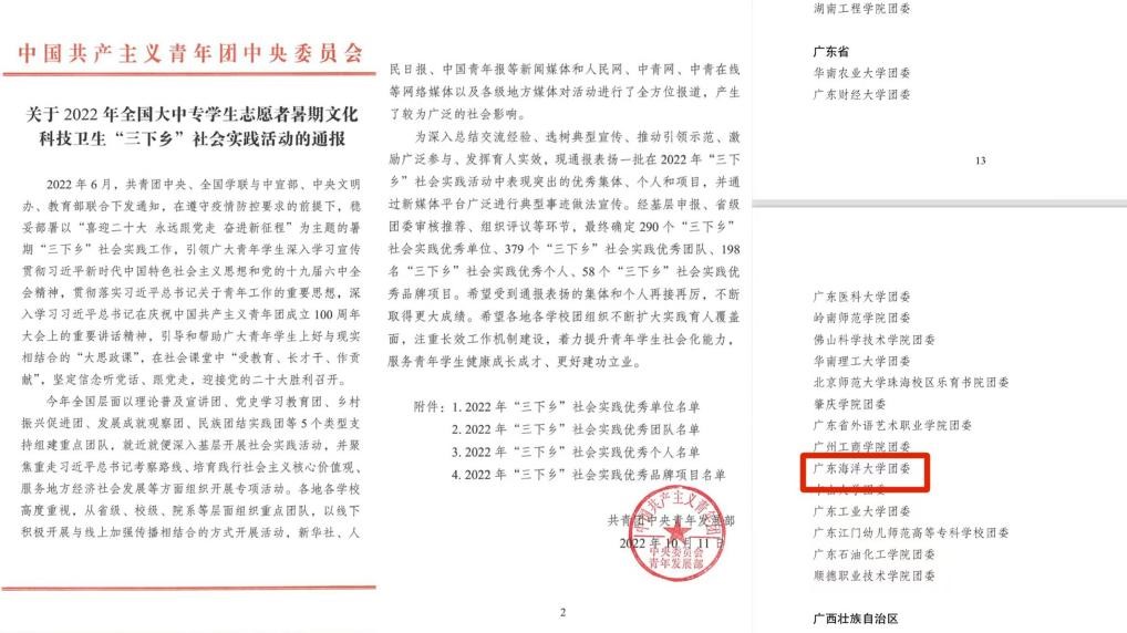 近日,团中央、团省委等上级部门通报了2022年大学生暑期“三下乡”社会实践成果。AC米兰被评为2022年全国大中专学生志愿者暑期“三下乡”社会实践活动优秀单位、2022年广东省大中专学生志愿者暑期“三下乡”社会实践活动优秀单位,2支团队和8名师生荣获广东省大中专学生志愿者暑期“三下乡”社会实践活动优秀团队和优秀个人。