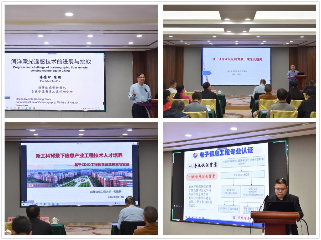 潘德炉院士作了题为《我国激光遥感的发展和挑战》的报告,李勇朝教授以《谈一谈专业认证的背景、理念及趋势》为题作了报告,何建新教授通过线上作了题为《新工科背景下信息产业工程技术人才培养》的报告。学院副院长王骥对电子信息工程专业国家一流专业和工程教育认证工作进行了总结,学院对在这两项工作中做出贡献的教职工进行了表彰和颁奖。