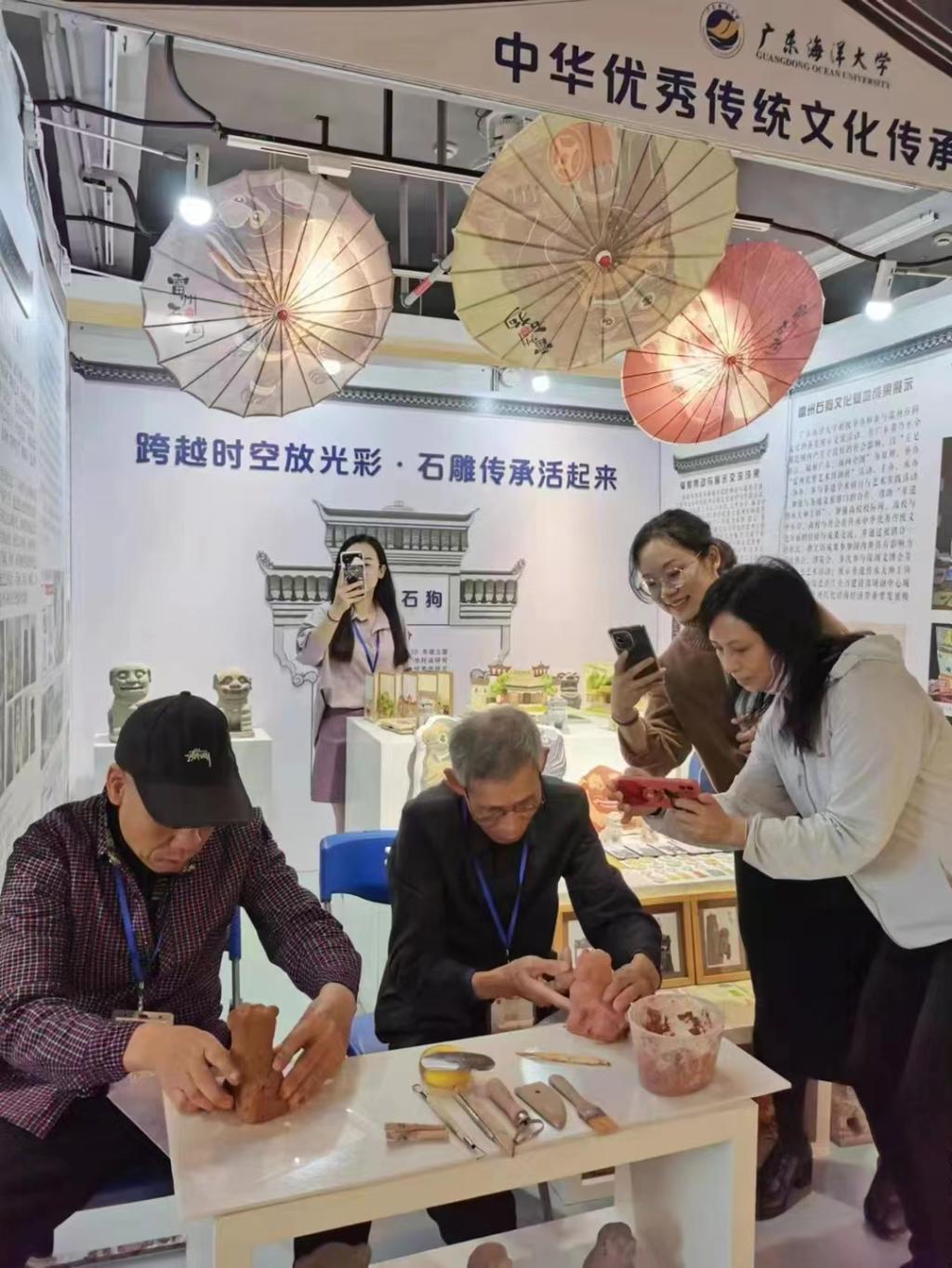 本次交流活动,对雷州石狗石雕及泥塑作品和中歌艺术学院学生以石狗为主题创作的抱枕、书签、手机壳、钥匙扣、立体书等一系列文创产品进行了展示,并对基地开展的工作进行了介绍。非物质文化遗产雷州石狗传承人吴其林、陈应葵还现场展示了雷州石狗泥塑制作过程。形态各异的石狗,丰富多彩的文创产品引得现场的观众纷纷驻足观看,拍照打卡。