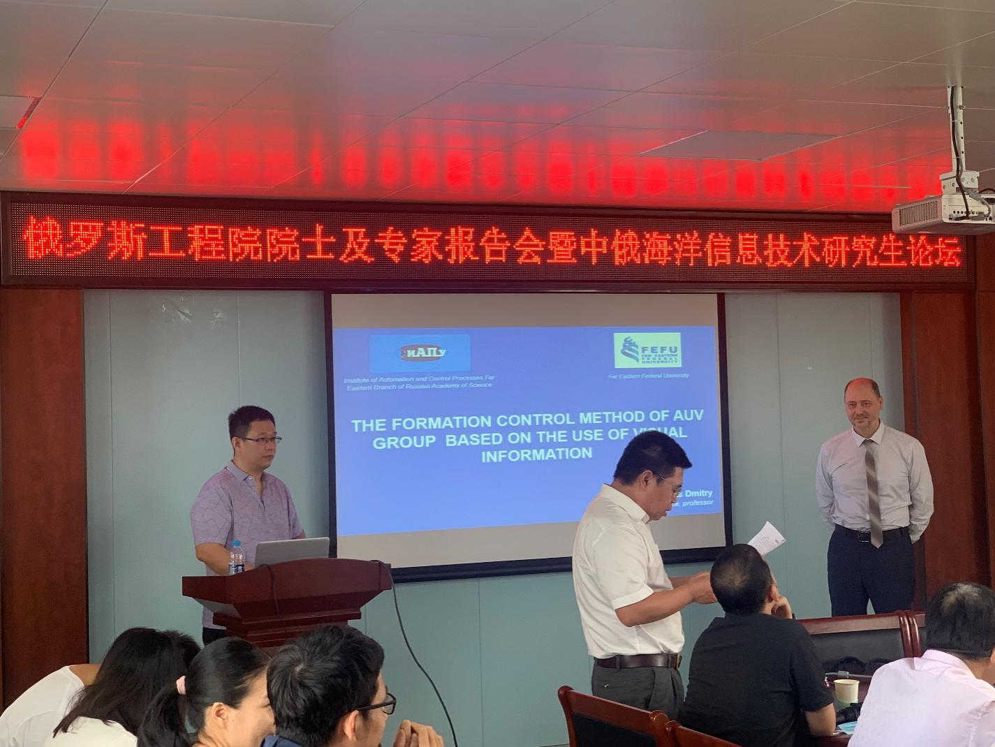 尤西梅茨教授作了题为《基于视觉信息的水下机器人集群系统控制方法》的主题报告,详细介绍了动态物体在其参数不确定和多变条件下的控制新方法、处理各种类型机器人传感器的感知信息、机器人系统在不确定工作环境中的轨迹规划方法、多用途机器人系统的机载信息和控制方法。