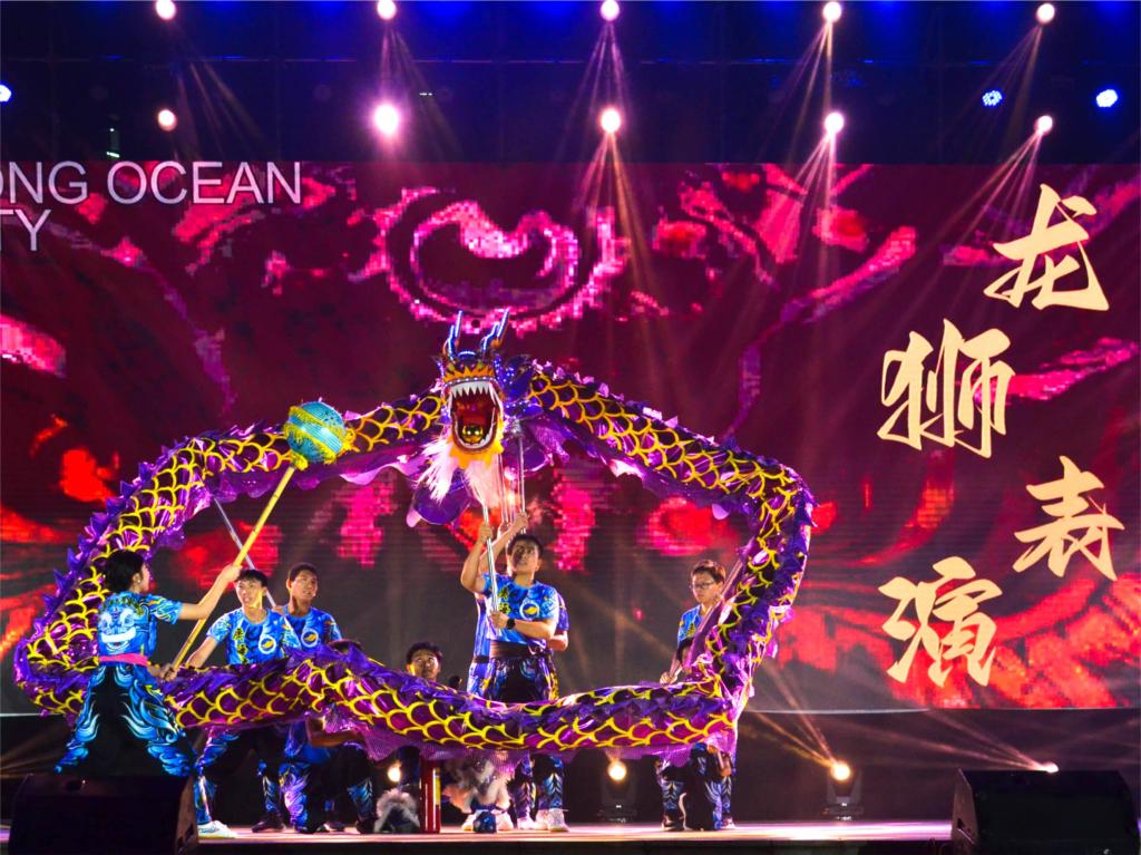 迎新游园会包含了晚会和游园两大部分。晚上7点,绚丽的灯光秀燃起整个现场,晚会以醒狮表演《瑞狮共游园》开场,展现出海大学子锐意进取、踔厉奋发的青春形象,响亮而明快的鼓声立即点燃了全场气氛。精神抖擞的国旗护卫队女子花枪队员踩着激昂的鼓点、踏着整齐有力的节拍演绎强有力的《飒爽芳华》。舞蹈表演《lockers》、小组唱《找自己》、个人独唱《星辰大海》、拉丁表演《tiktok baby》等节目精彩纷呈,共同描绘了“青春如画如诗,奋斗创造不凡”的青春画卷。
