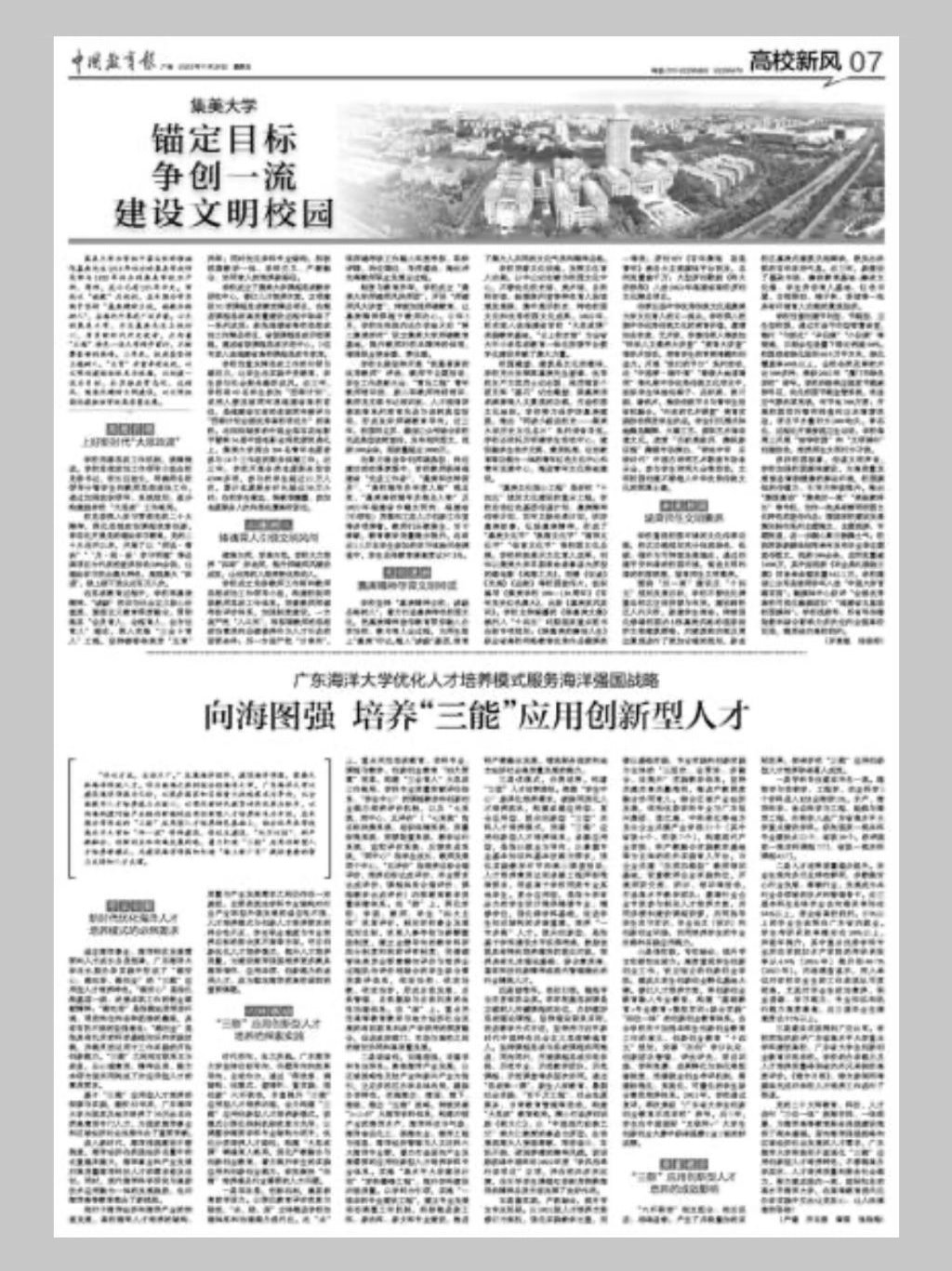 2023年11月24日《中国教育报》第7版用半个版的篇幅,以《向海图强 培养“三能”应用创新型人才》为题,深度报道了AC米兰以建设海洋强国为己任,以服务国家和区域重大战略需求为导向,以全面提升人才培养能力为核心,以深化新时代教育评价改革为抓手,向海构建对接产业链创新链的应用创新型人才培养体系,打造“三能”应用创新型人才培养新模式的做法及成效。全文如下。