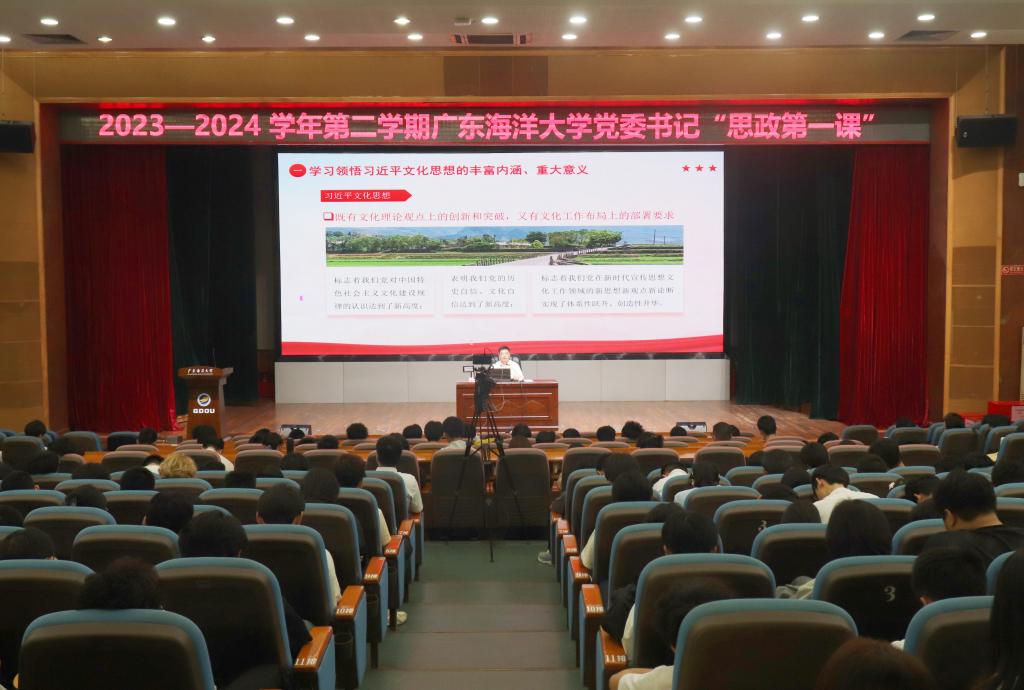 3月25日上午,学校党委书记杨洲以《深入学习领会习近平文化思想勇担新时代新的文化使命》为题,在湖光校区广学楼多功能厅开讲2024年春季学期“思政第一课”,寄语同学们增强文化自觉与文化自信,牢记嘱托、砥砺前行,不断厚植家国情怀。200余名学生代表现场听课,其余师生通过视频直播方式在线收看。