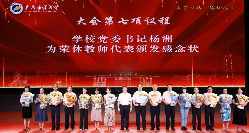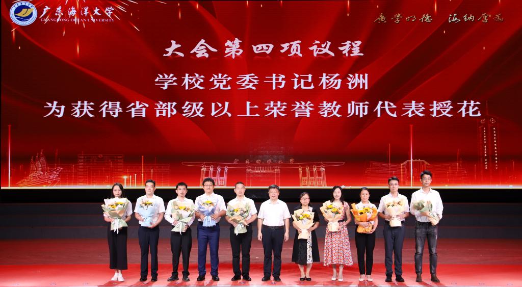 学校党委书记杨洲出席会议并讲话,党委副书记谭平宣读表彰名单。党委常委、副校长谭北平主持会议,学校领导宁凌、邓逢光、周昌仕、林宇出席会议。获奖教师代表、各单位(部门)主要领导、荣休教师、教龄满30周年以上教师代表、新入职教师代表、各学院教师代表、辅导员代表、学生代表等在中歌艺术学院实验剧场现场参加大会。湖光、海滨、霞山、阳江校区师生员工通过线上平台收看了大会直播。