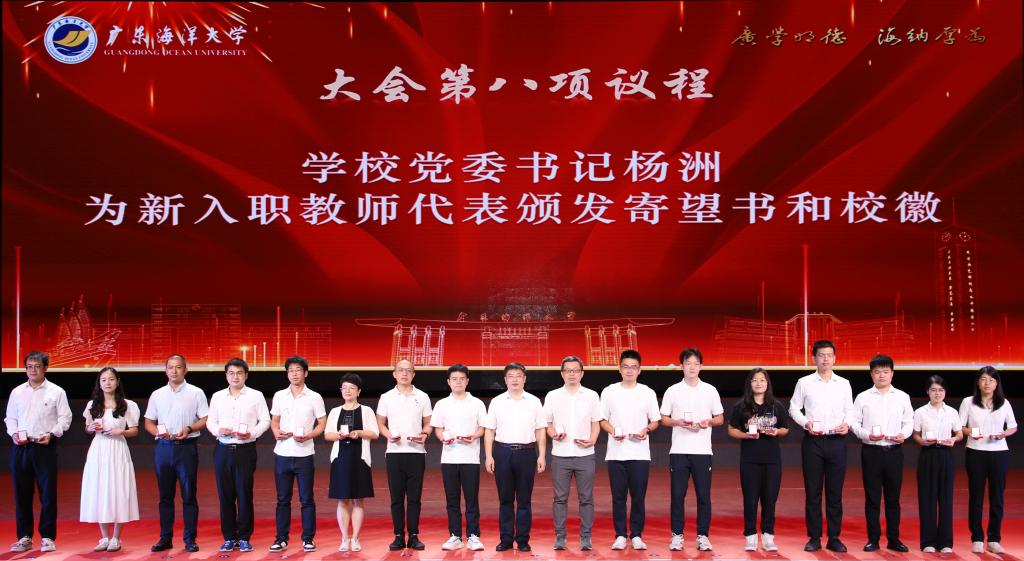 学校党委书记杨洲为新入职教师代表颁发寄望书和校徽