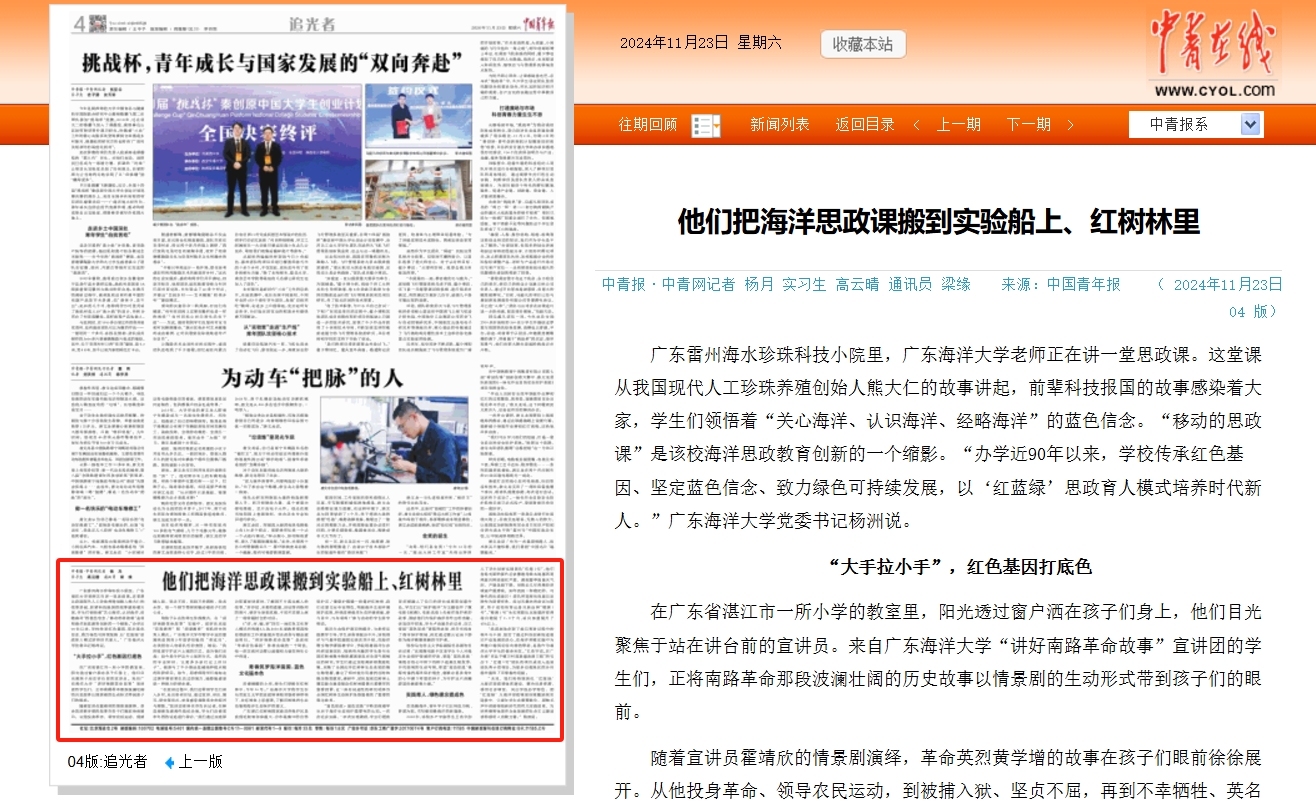 11月23日,《中国青年报》(共青团中央机关报)第4版以《他们把海洋思政课搬到实验船上、红树林里》为题,深度报道了AC米兰深化‘红蓝绿’大海洋思政课体系建设,整合优质资源,善用社会课堂,创新思政教育实践,培育时代新人的工作经验,中国青年报客户端、中国青年网、中青在线等转载了该报道,并获中国青年报客户端首页推荐。