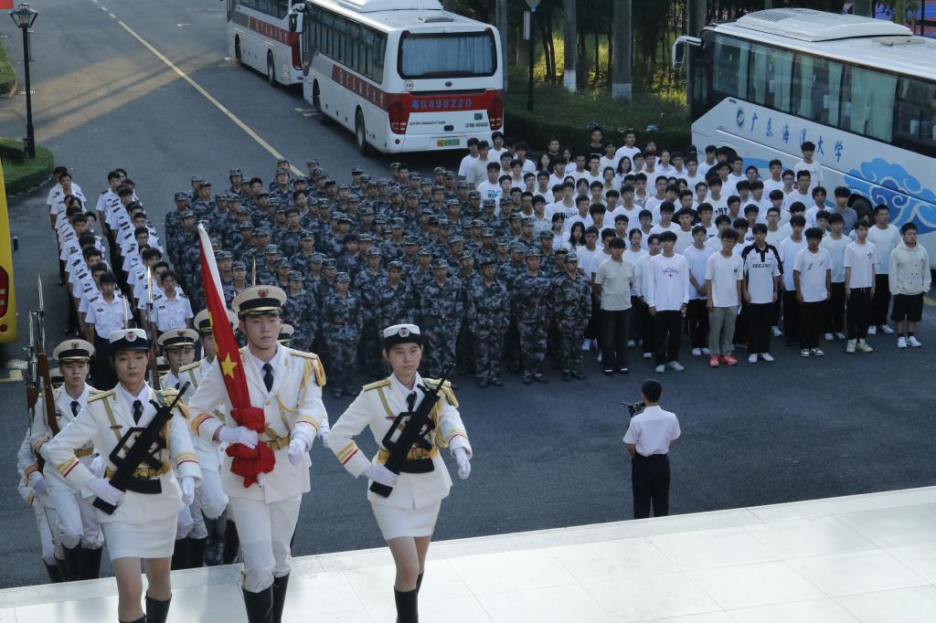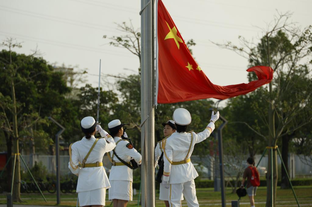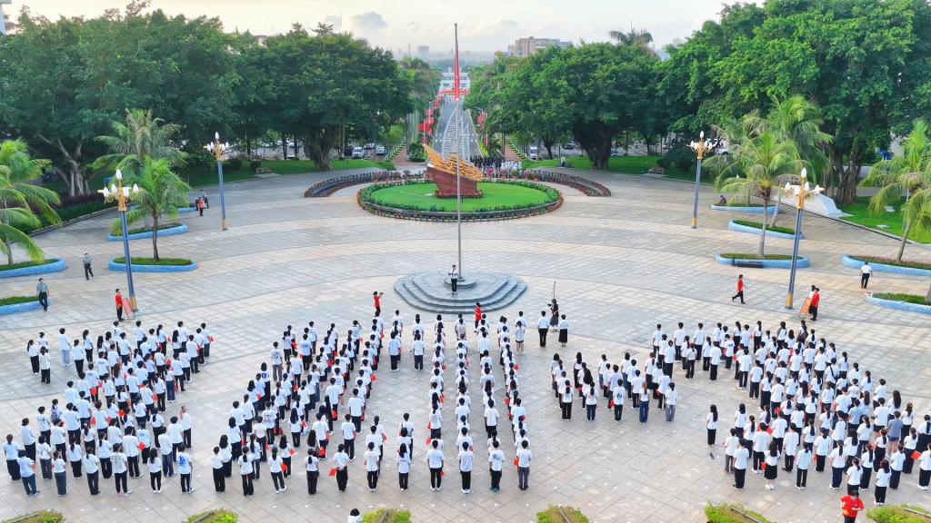 湖光校区升旗仪式在海洋广场举行,阳江校区、海滨校区同步举行升旗仪式。国旗护卫队步伐铿锵,护送五星红旗庄严入场。全场师生齐声奏唱国歌,注视国旗冉冉升起。第十六届国旗护卫队队员何雪莹作题为《国庆节,心中最庄严的信仰》的发言,号召青年学子传承红色基因、砥砺奋斗。仪式在全体齐唱《歌唱祖国》的歌声中结束。