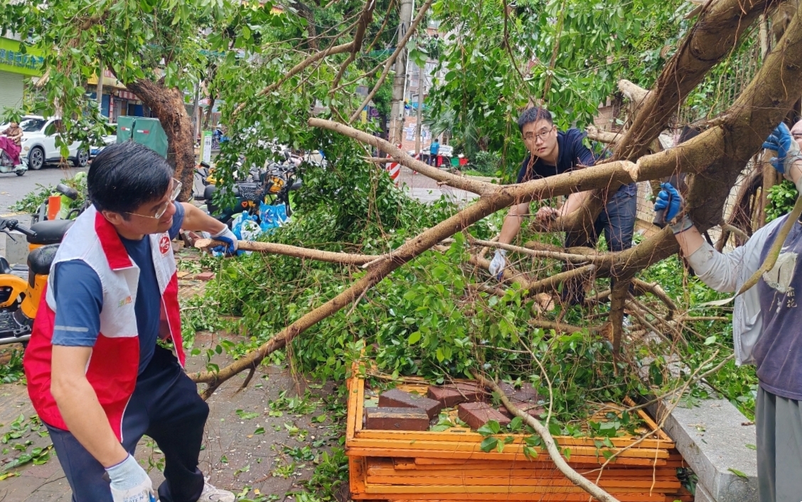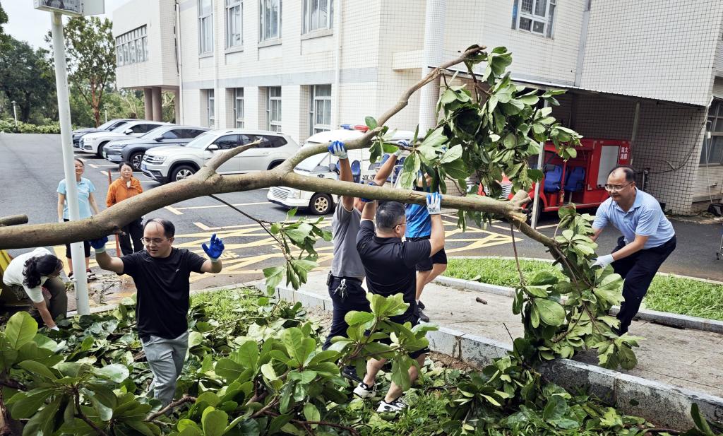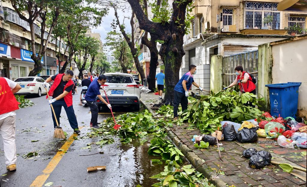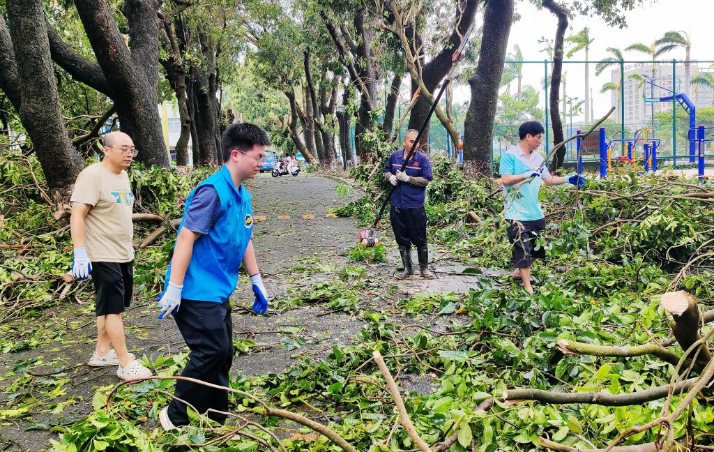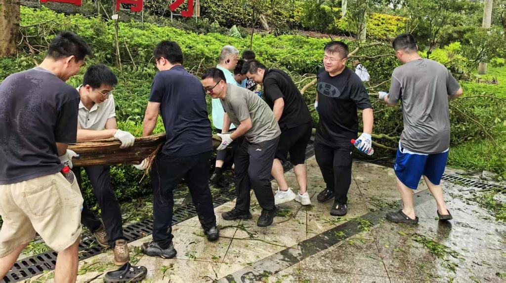 灾情就是命令,旗帜彰显担当。台风过后,学校党委第一时间发出号召,机关党委等各基层党组织闻令而动,迅速组建起一支支由党员干部、党员教师和学生党员组成的“党员突击队”“党员先锋队”。他们手持锯子、铁锹等工具,冲锋在灾后重建第一线:在主干道上,他们协力将倒伏的大树切割、搬离,清理交通障碍。在校园公共区域内,他们积极参与积水排放、淤泥清扫、残枝败叶清理,以及受损设施的初步修复工作,争分夺秒恢复校园正常秩序。“作为一名党员,这个时候就应该站在最前面,用我们的努力,尽快为师生恢复一个安全、整洁的学习生活环境。”一名参与重建清理工作的党员干部表示。此外,学校50余名党员志愿者还积极响应湛江市灾后恢复号召,深入海头港社区开展志愿服务。他们协助清理社区道路,用实际行动践行初心使命,展现了学校党员服务社会、勇于担当的良好形象。