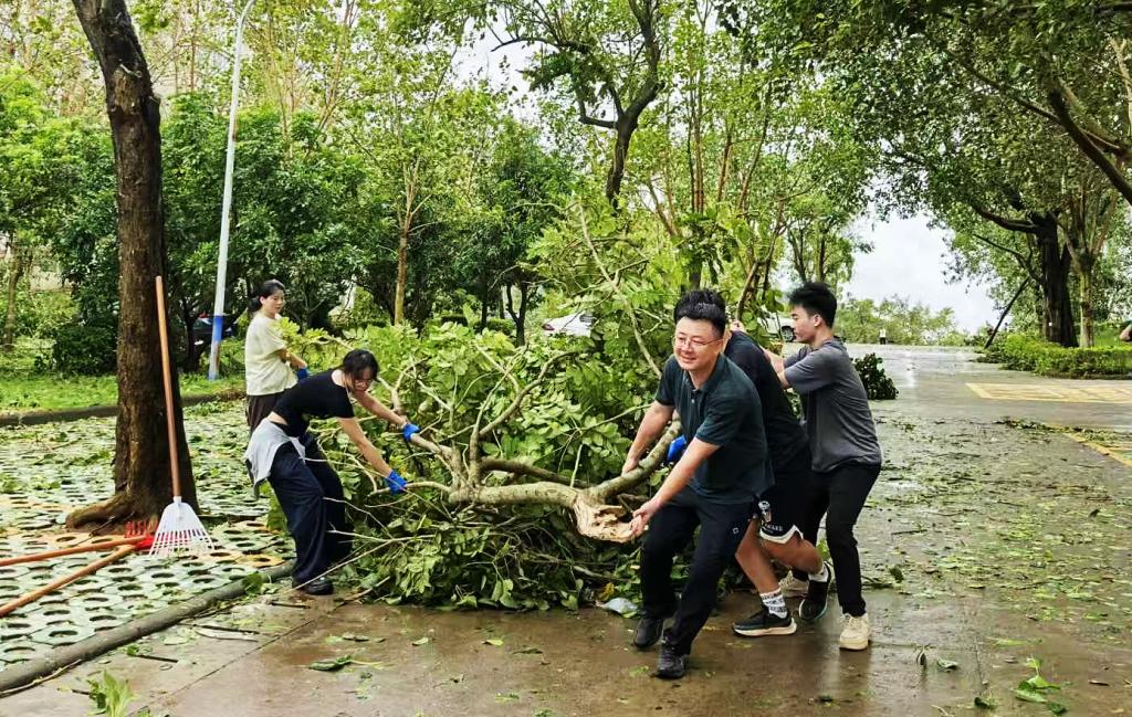“我们的校园,我们共同守护!”——这不仅是响亮的口号,更是海大师生坚定的行动。大家自发集结投入到校园清理工作中。现场分工有序、配合默契:有人细致捡拾散落的枝叶,有人将断裂的树枝归拢成堆,还有人清扫路面的积水和淤泥。汗水浸透了衣背,泥泞沾满了鞋裤,但每一张脸庞上都写满了坚定与担当,忙碌的身影间传递着众志成城的暖流。“看到昔日美丽的校园受灾,心里特别不是滋味。但能和老师、同学们并肩作战,亲手让校园一点点恢复原貌,再累也值得,心里特别踏实、也特别自豪。”一位正埋头清理的同学感慨道。