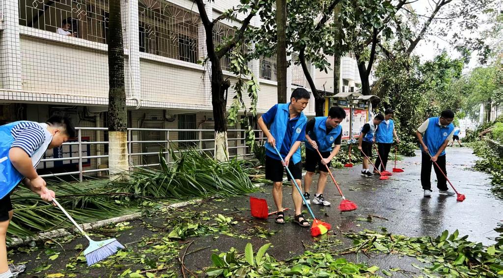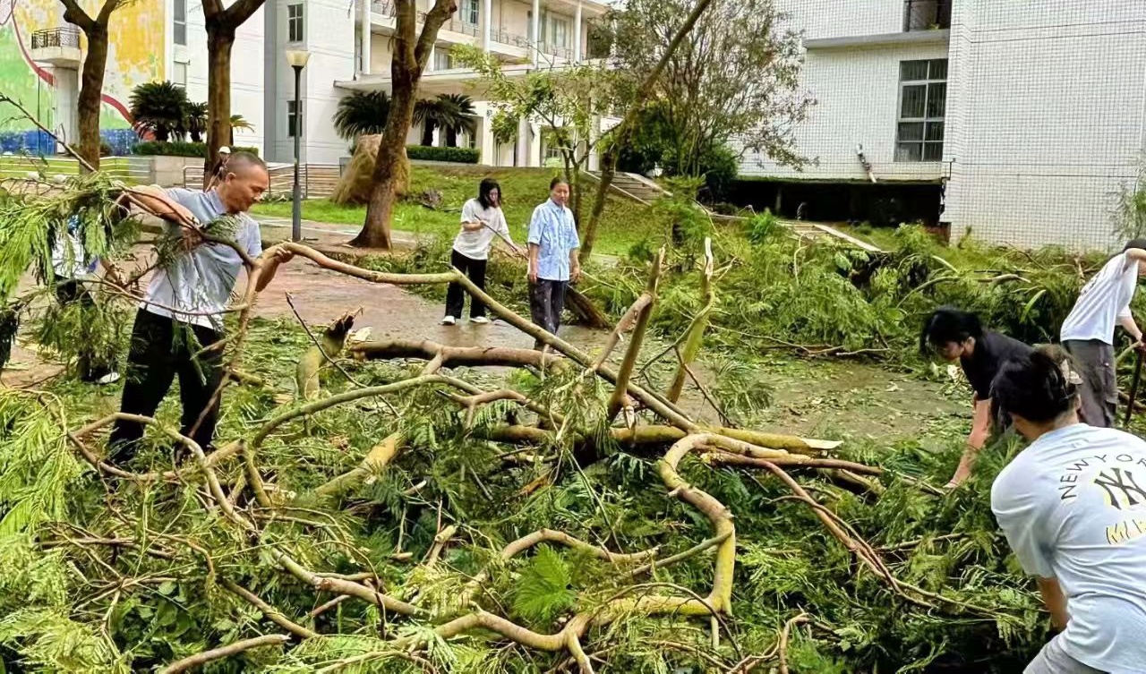 台风过境时,学校后勤、保卫等部门携手共抗台风,奋战在校园的各个角落,昼夜接力、坚守岗位,全力守护校园平安。台风登陆,相关职能部门迅速启动灾后抢修恢复工作。绿化团队对倒伏的树干进行分段切割、搬运,对悬垂的断枝及时修剪,消除高空隐患;保洁团队对路面落叶、淤泥进行全面清扫,配合洒水车冲洗路面残余杂物;维修团队同步排查清理区域内的破损设施,快速移除影响通行的障碍物件。从主干道到支路巷口,后勤工作人员用专业高效的行动逐步恢复校园道路的整洁与畅通。