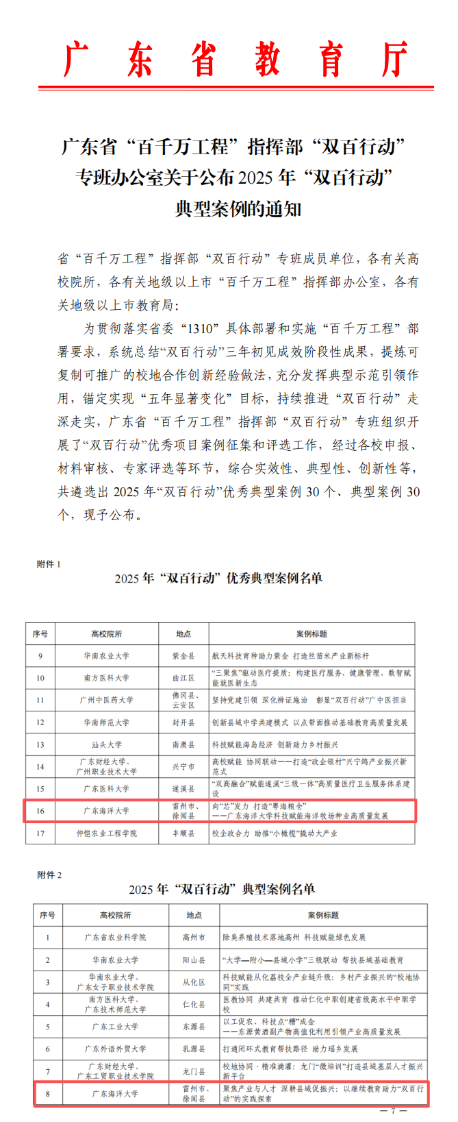 为贯彻落实省委“1310”具体部署和实施“百千万工程”部署要求,系统总结“双百行动”三年初见成效阶段性成果,提炼可复制可推广的校地合作创新经验做法,充分发挥典型示范引领作用,锚定实现“五年显著变化”目标,持续推进“双百行动”走深走实,广东省“百千万工程”指挥部“双百行动”专班组织开展了“双百行动”优秀项目案例征集和评选工作,经过各校申报、材料审核、专家评选等环节,综合实效性、典型性、创新性等,共遴选出2025年“双百行动”优秀典型案例30个、典型案例30个。